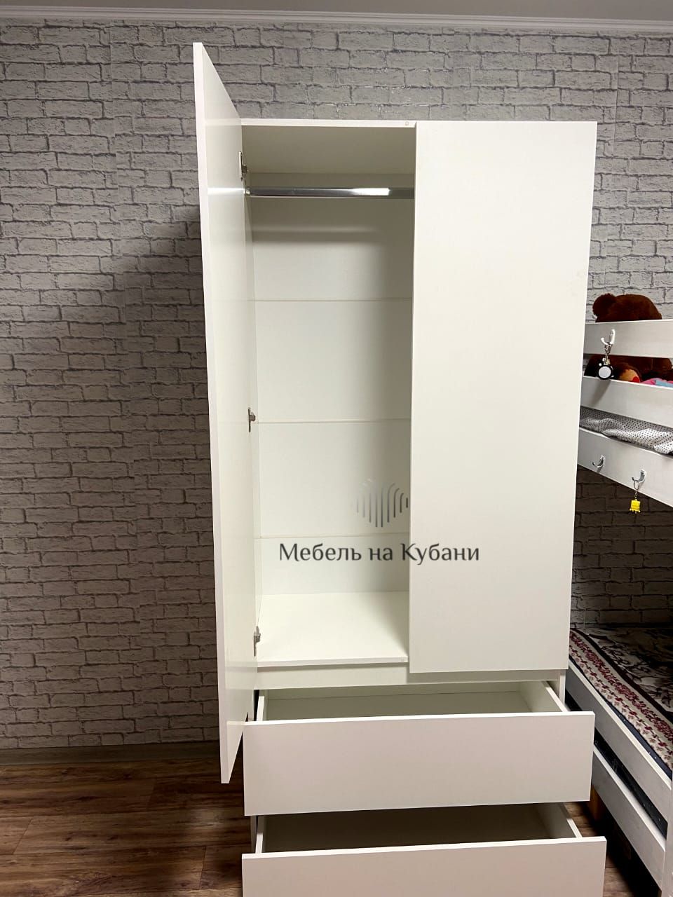 • Очень просторная распашная секция с металлической штангой для хранения одежды