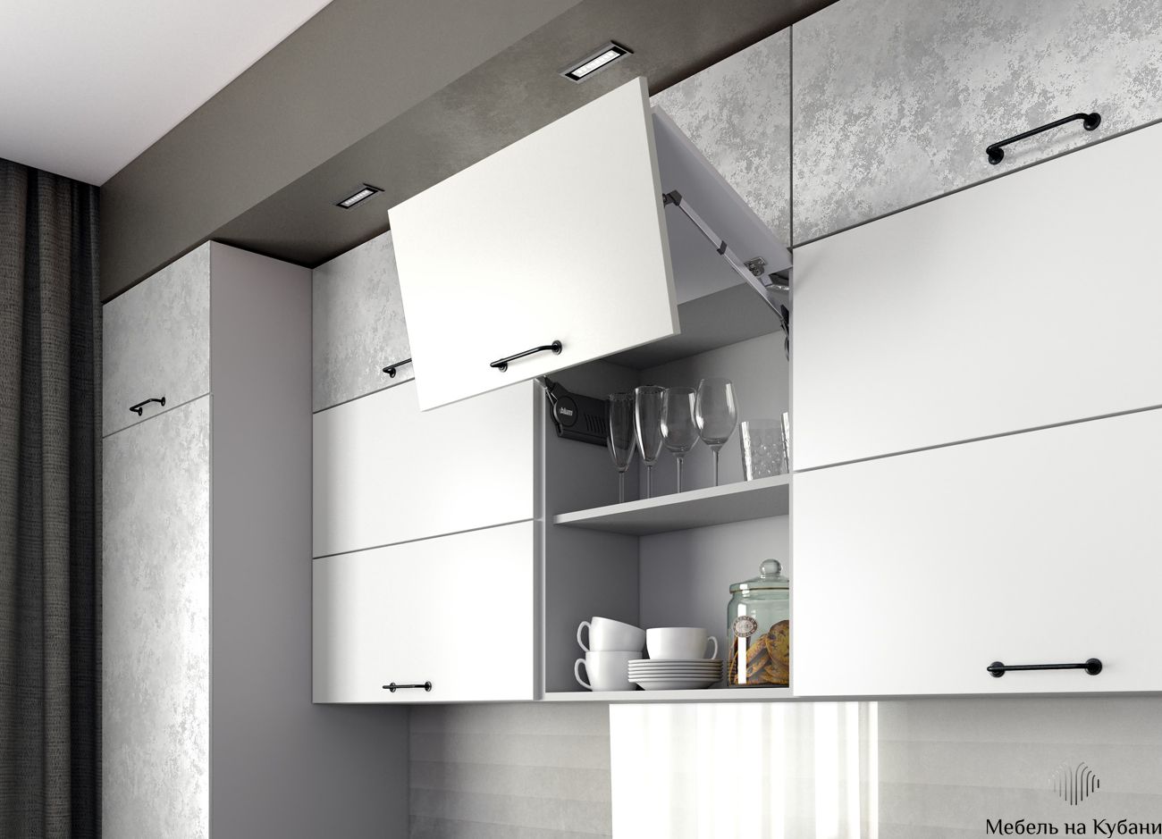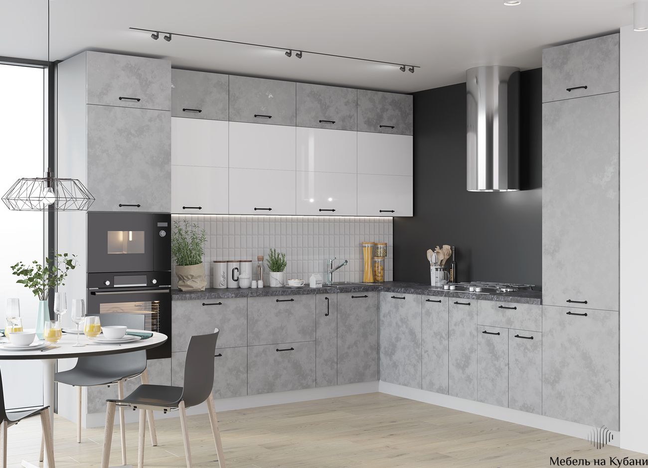 Дверцы из матового стекла можно поддержать светильниками в том же стиле, геометрической формы мебельные ручки помогают создать правильную атмосферу. Нотку мягкости придаёт включение в гарнитур деревянных фасадов. Все оттенки – бетона и дуба цикория соответствуют выбранной стилистике.