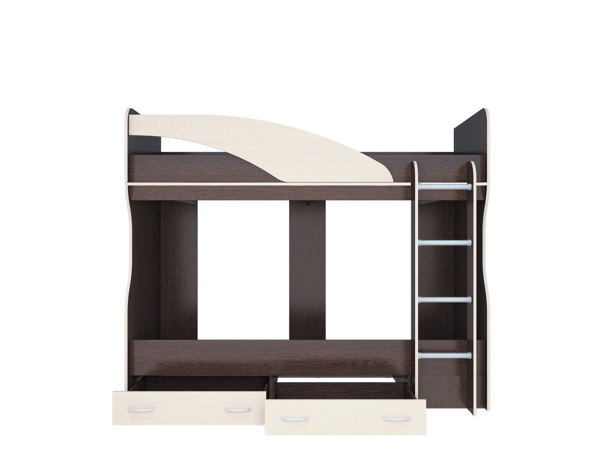 • Кровать-2-х ярусная имеет в своем составе имеет два спальных места сверху и снизу, лестницу, и два выдвижных ящика снизу