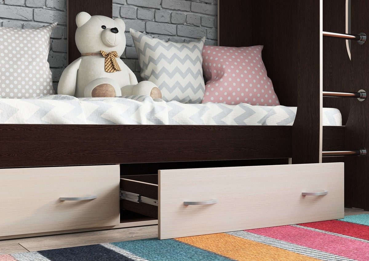 • Нижнее спальное место дополнено двумя выдвижными ящиками на роликовых направляющих