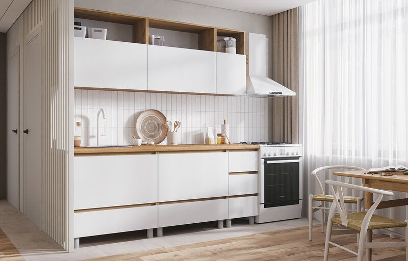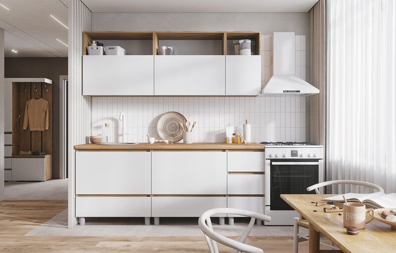 Готовое решение для организации интерьера предлагает кухня Хелен: обладая компактными габаритами, она гармонично впишется кухню любого размера. Она выполнена в скандинавском стиле с ровными фасадами без ручек, в сочетании теплых оттенков золотого дерева и белоснежных панелей, благодаря чему создает ощущение светлого уюта, чистоты и экологичности. Фасад обладает приятной на ощупь, шелковистой фактурой поверхности, которая не сохраняет отпечатков после касания.