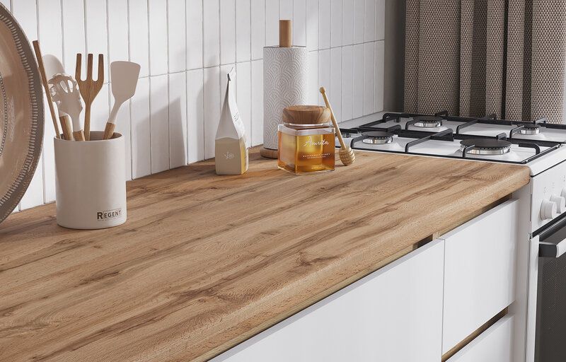 Кухня укомплектована наборной столешницей декора "Дуб Вотан" 38 мм. Каждый элемент столешницы закромлен по периметру, обеспечивая защиту в агрессивной влажной среде.
