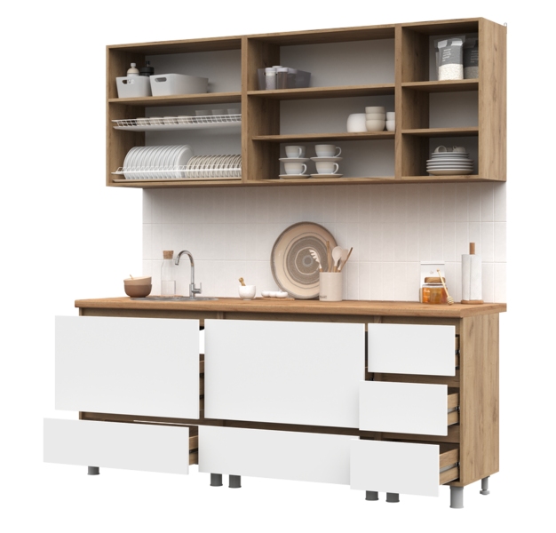 - Нижние модули шириной по 800 мм., один из которых предназначен под мойку имеют крупные выдвижные ящики, имеет место под мойку и вместительную секцию с полкой для крупной посуды или кухонной техники.