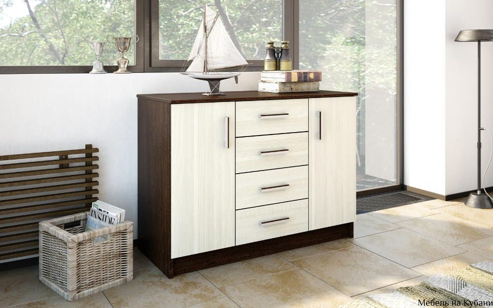Модель К1000-2Д Комод оснащён четырьмя выдвижными ящиками и и двумя дверками, фурнитура используется стандартная российских и европейских производителей.