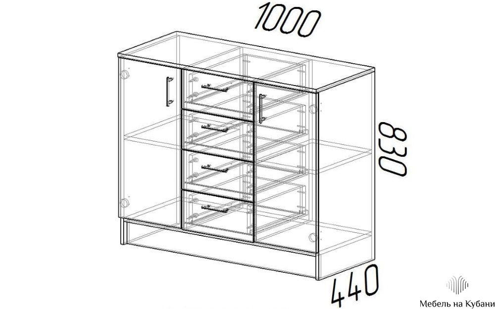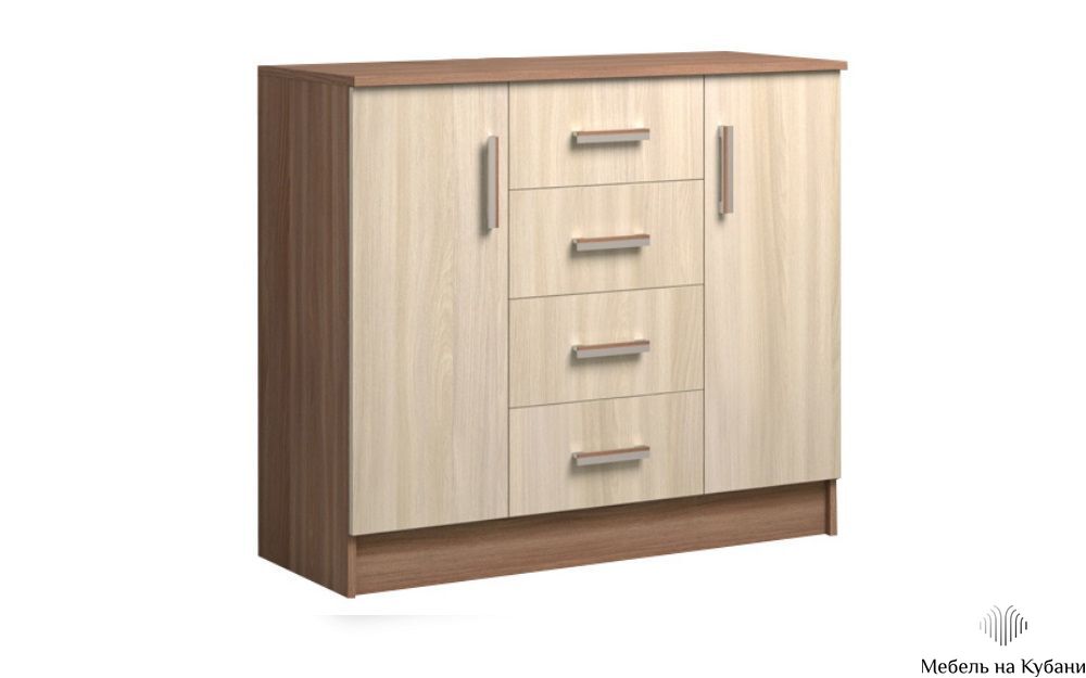 Модель К1000-2Д Комод оснащён четырьмя выдвижными ящиками и и двумя дверками, фурнитура используется стандартная российских и европейских производителей.