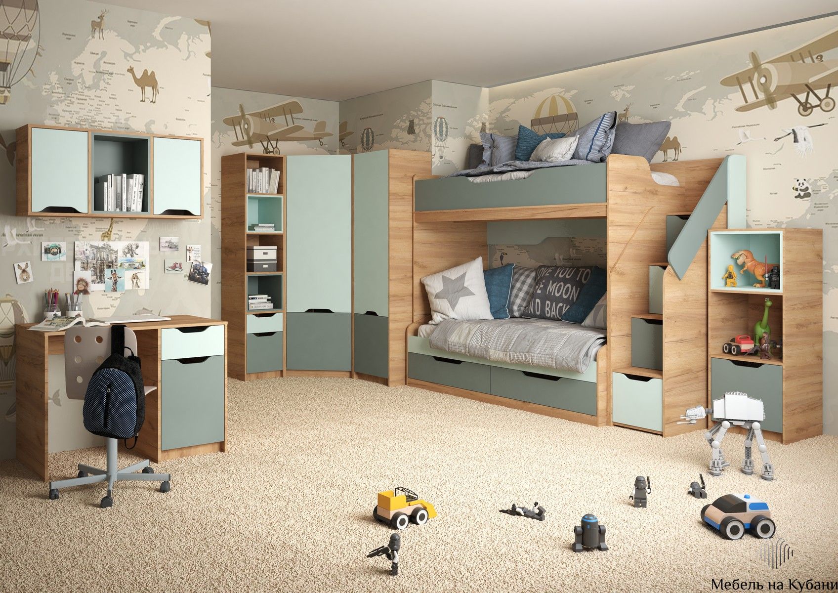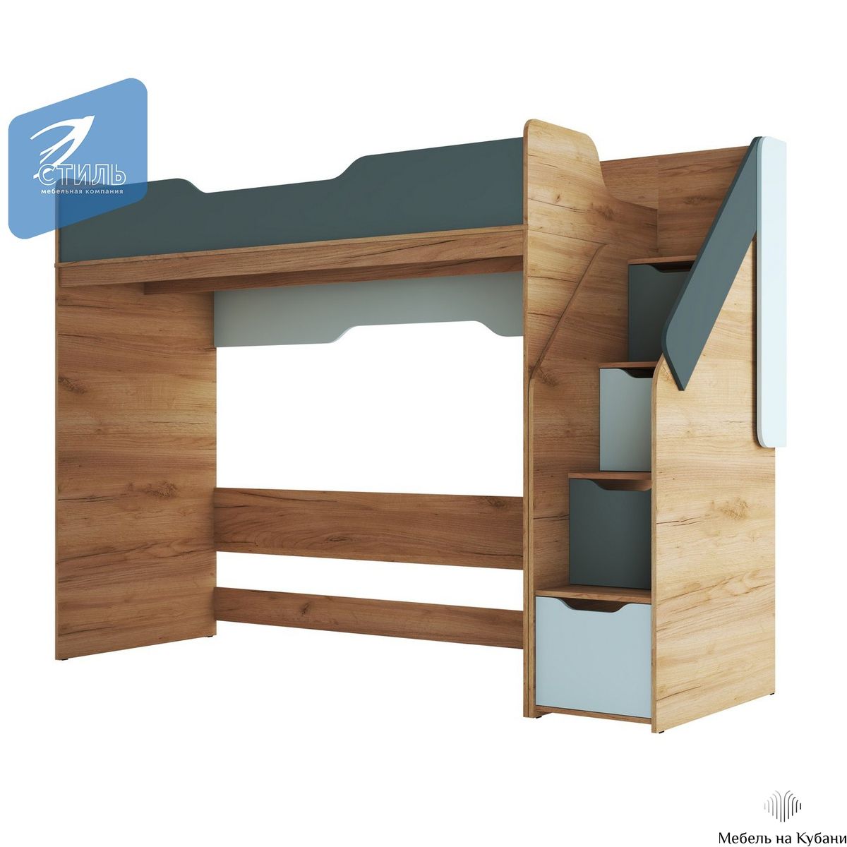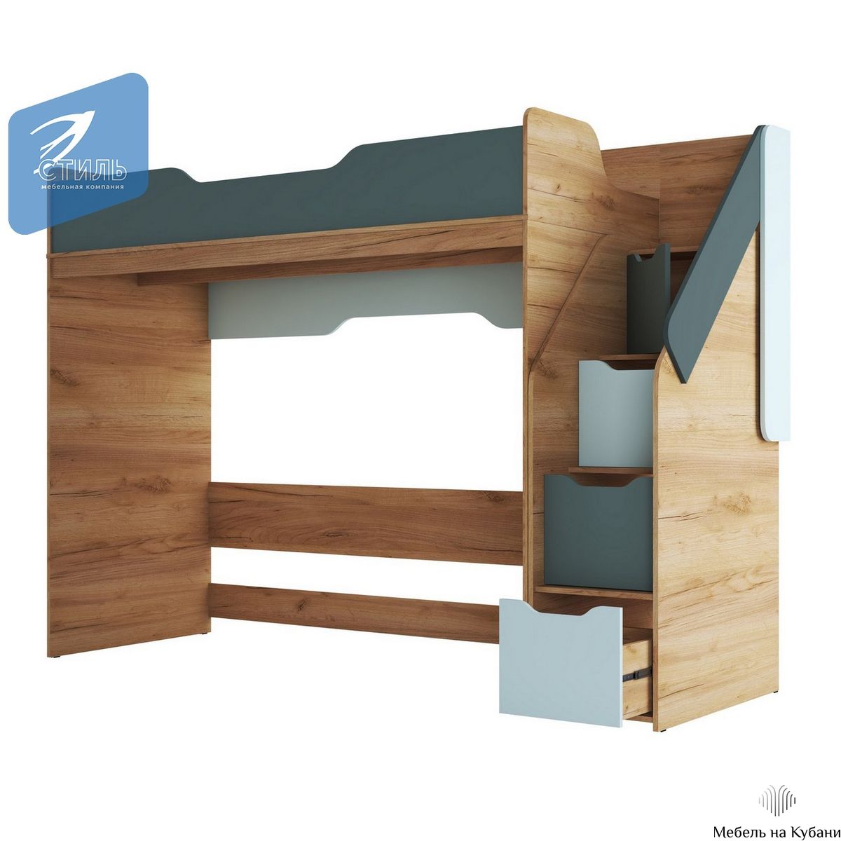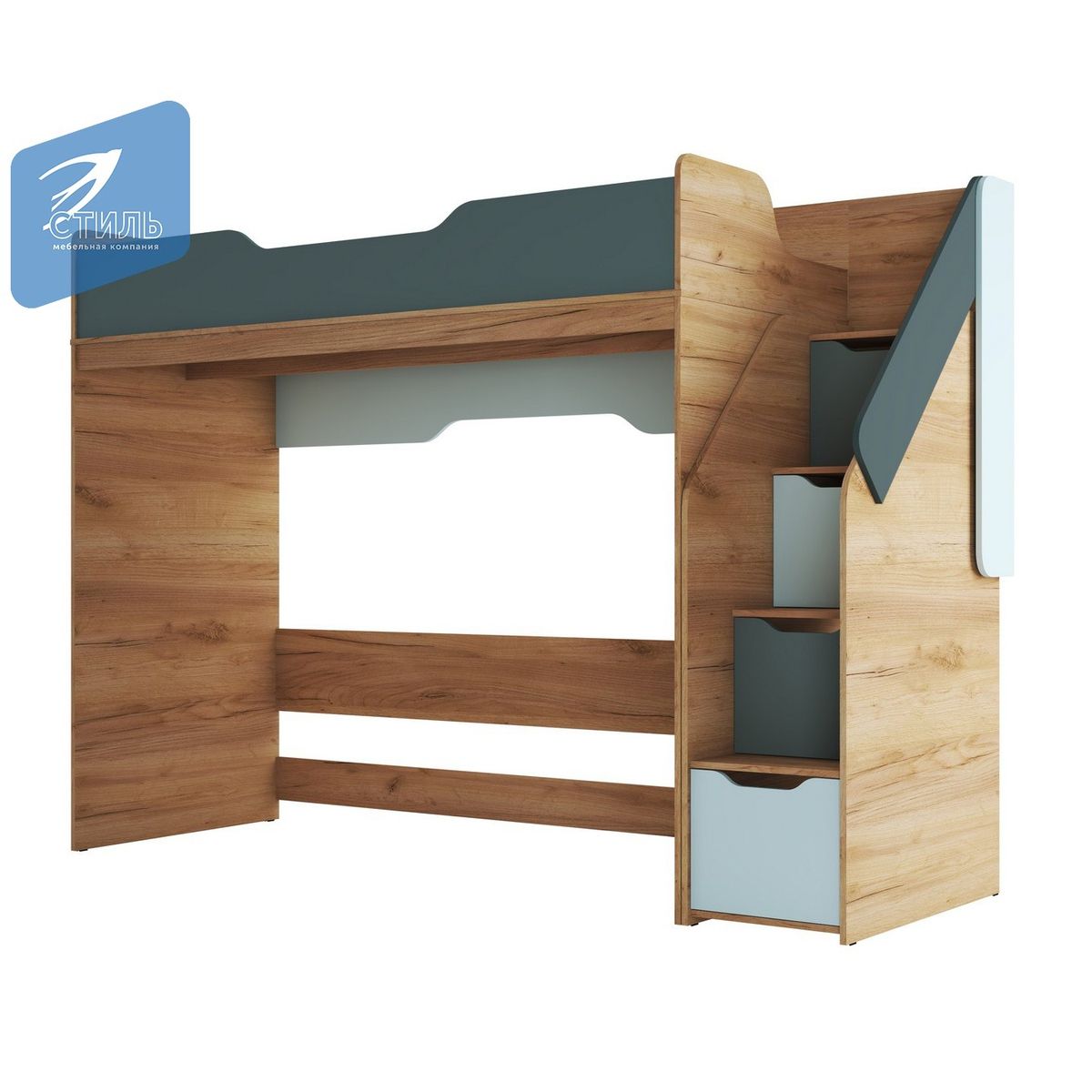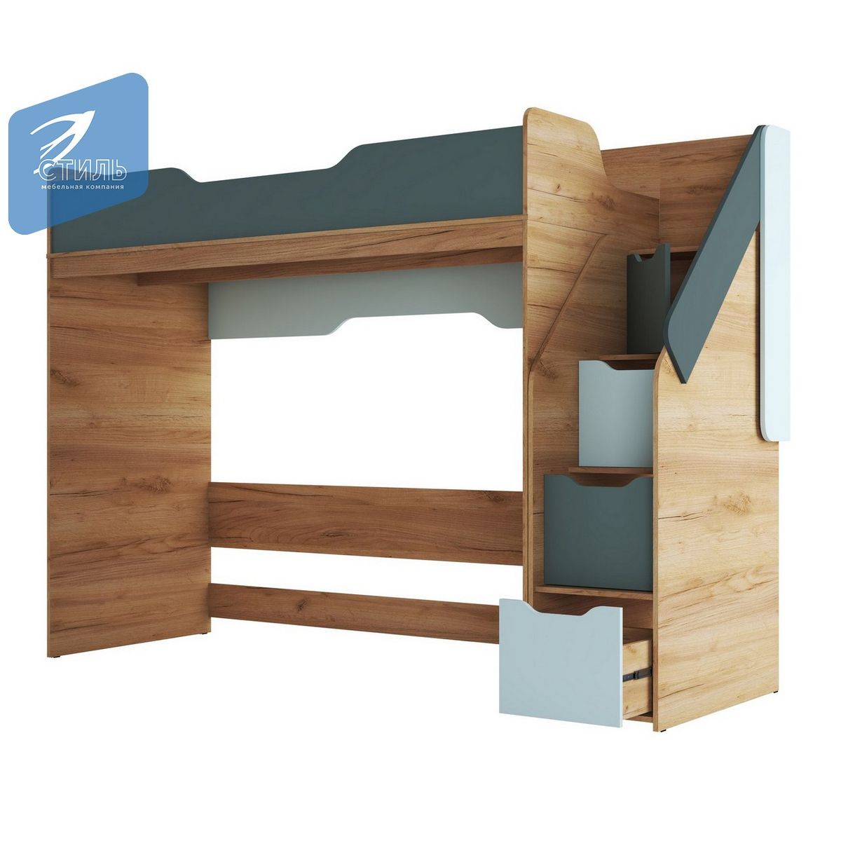 Rich КР-001 Кровать чердак Дуб Крафт золотой - Мята/Сумеречный голубой