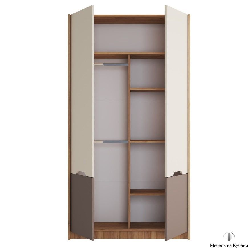 створках произведена фрезеровка, заменяющая ручку. Длина фрезеровки 284 мм. Створки внутренние. Корпус шкафа ЛДСП 16мм в кромке 2,0 по видимой стороне в цвет корпуса, кромка скрытых частей изделия 0,4 мм, задние стенки ЛХДФ 3,2 мм. Внутри изделия, по центру, расположена перегородка, справа три полки, слева две штанги овальные металлические под одежду. В верхней части шкафа ниша высотой 320 мм. Расстояние между нижней вязкой и полкой и верхней вязкой и полкой 300мм, расстояние между средними полками два проема по 460 мм. Ниша со штангами высотой 1568 мм. Шкаф необходимо крепить к стене чтобы исключить риск опрокидывания.