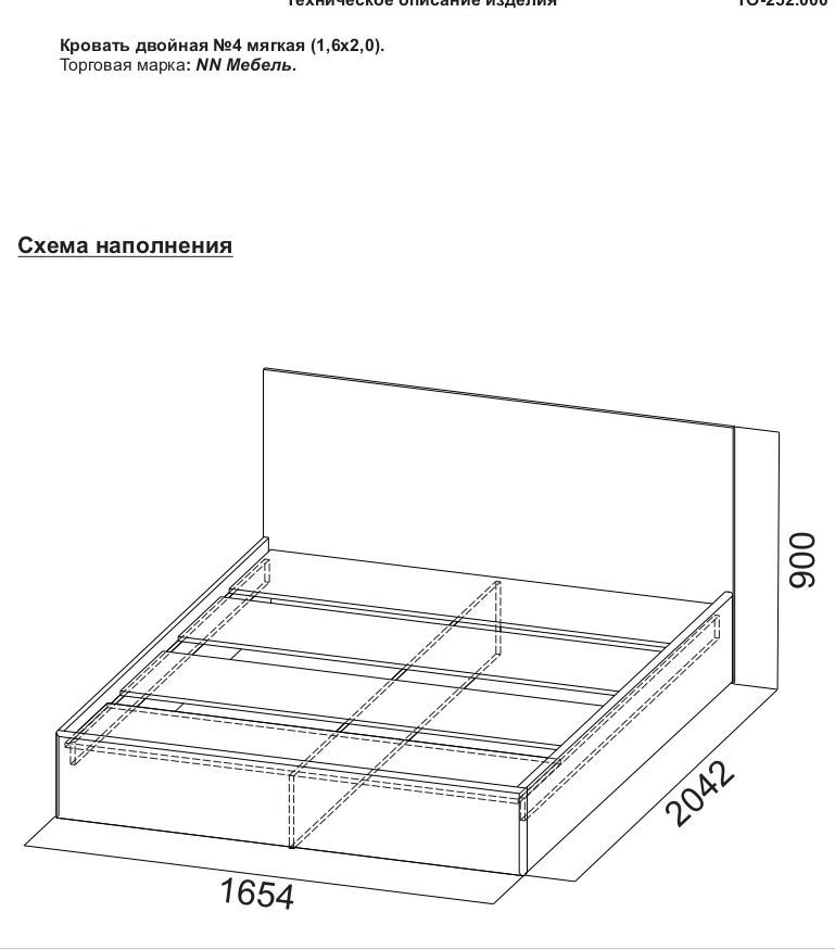 Число местдвуспальнаяШирина спального места1600 ммДлина спального места2000 ммШирина1654 ммВысота900 ммДлина2042 ммПроизводительNNОснование под матрасНастилЦветБежевыйМягкое изголовьеесть