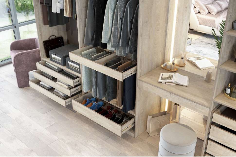 Угловой шкаф можно дополнить полками, а также дверцами с зеркалом или без.