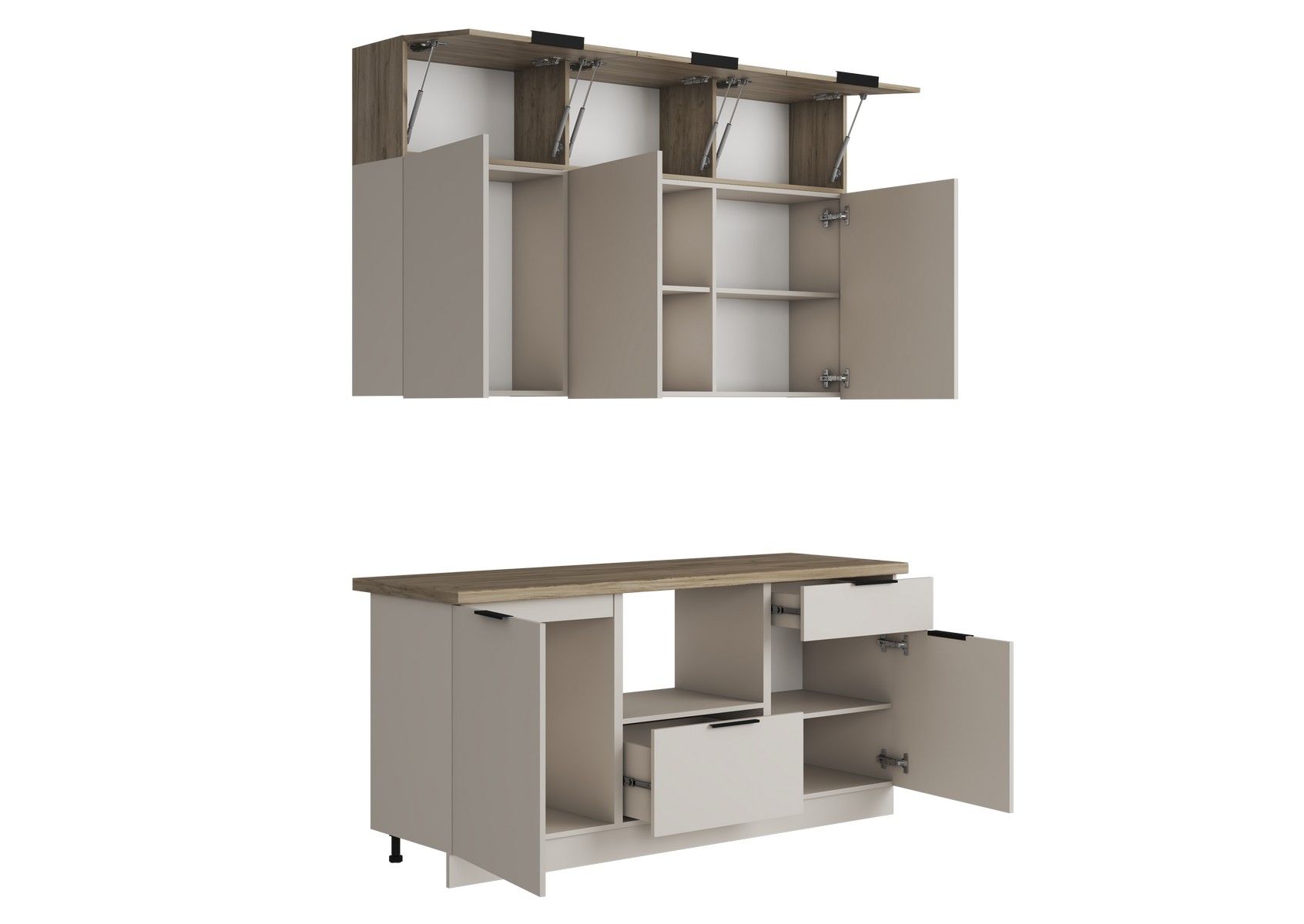 Открывание нижнего яруса верхних шкафов осуществляется путём захвата за счёт увеличенных по высоте фасадов относительно самого корпуса, антресоль при помощи пластиковой профиль-ручки.