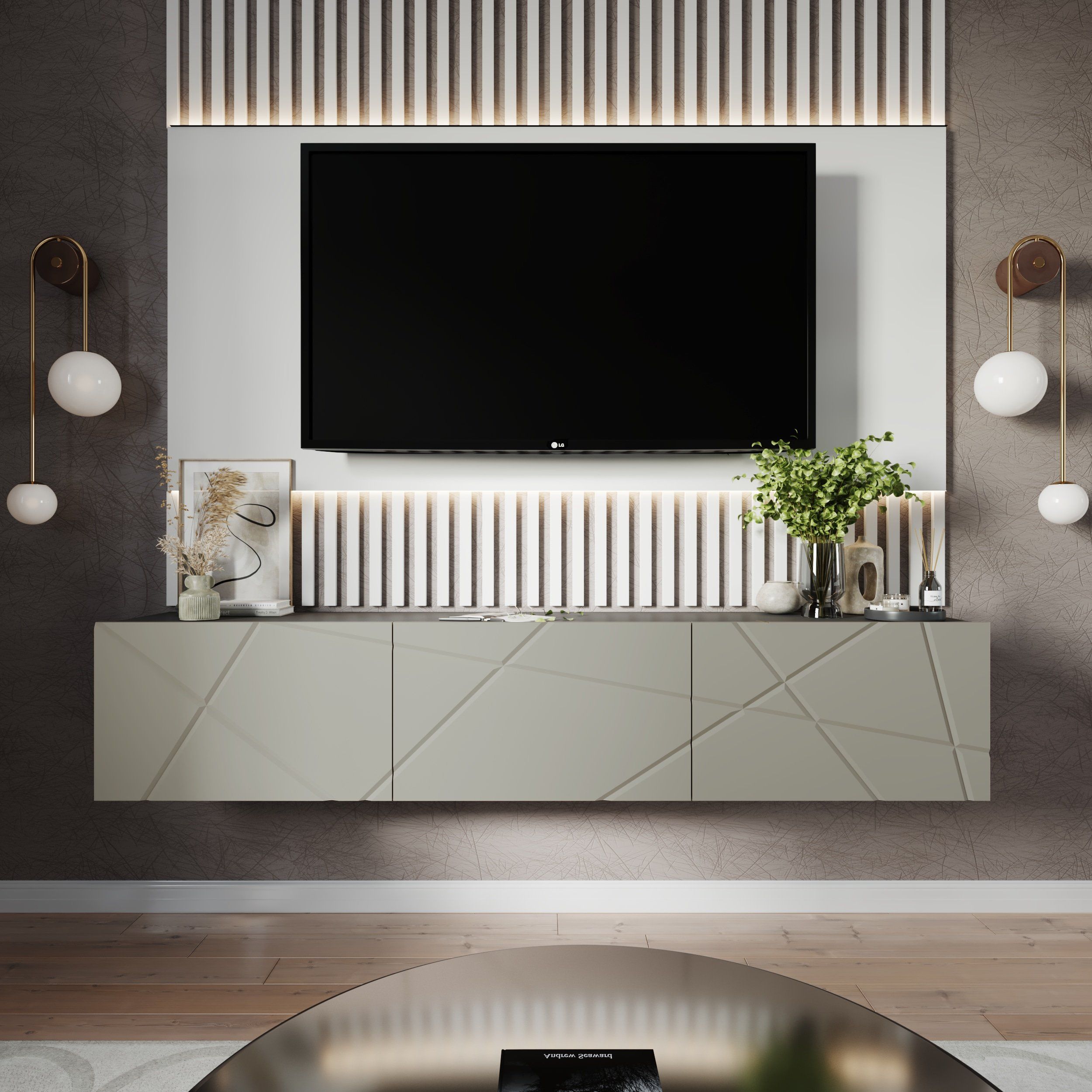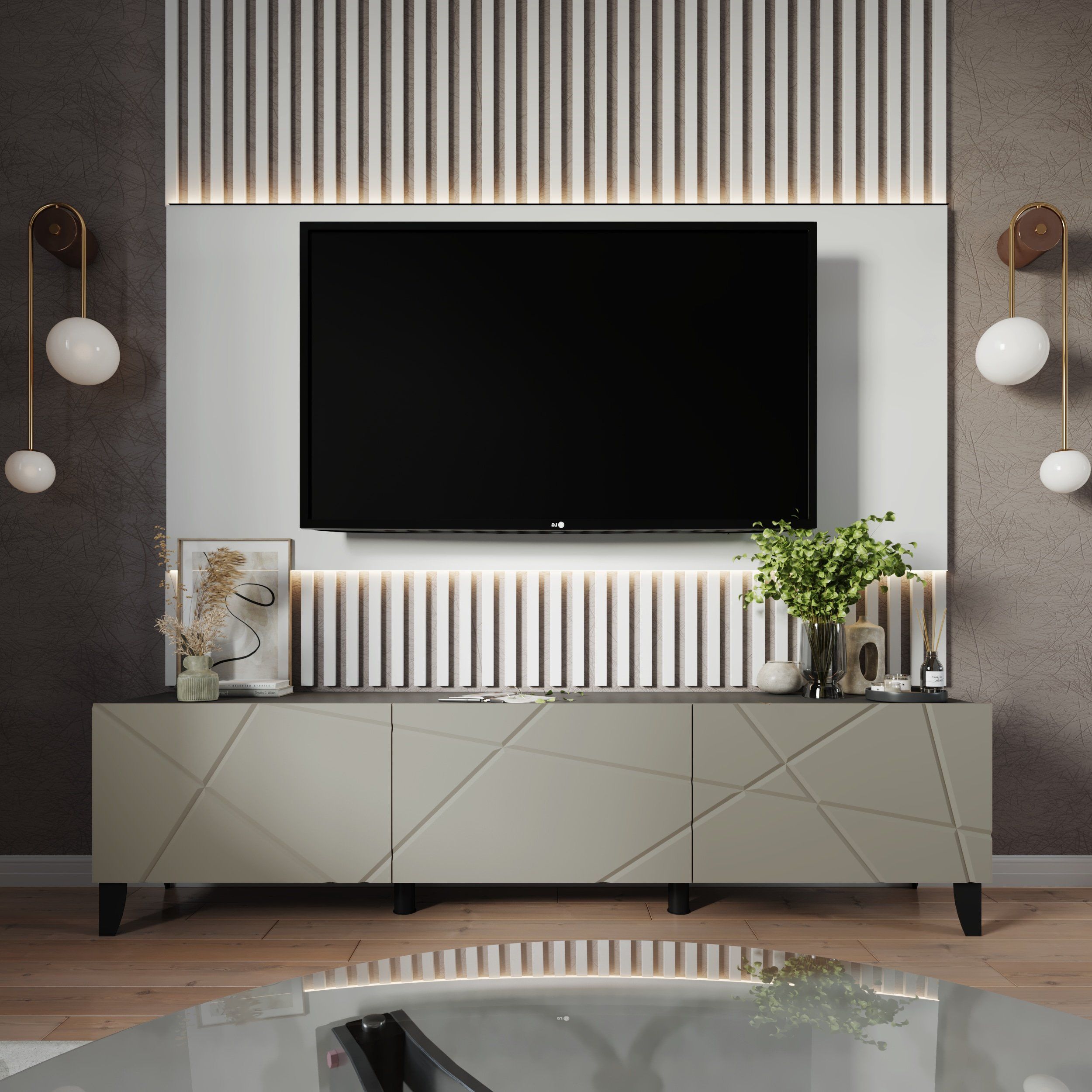 Назначениепод телевизорШирина2000 ммВысота525 ммГлубина384 ммМатериал фасадаМДФЦветГрафит Серый/ МДФ Панакота