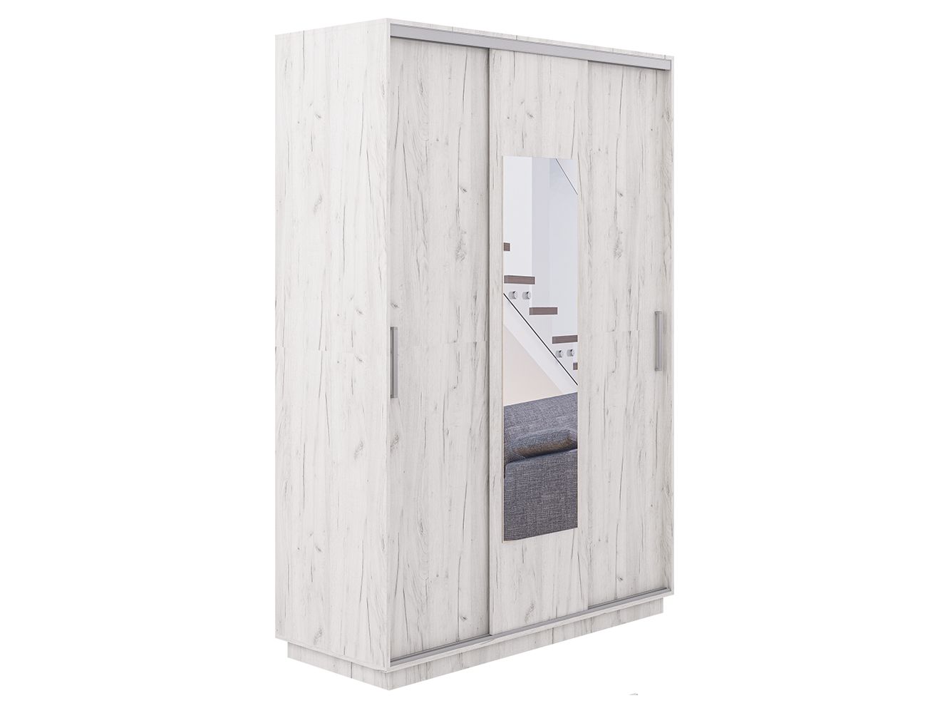 Конструкция включает в себя: шесть полок, три вместительные ниши, штанга для одежды, зеркало. Для плавного и бесшумного использования предусмотрена особая комбинация направляющих и роликов, фасады снабжены опорной алюминиевой системой.