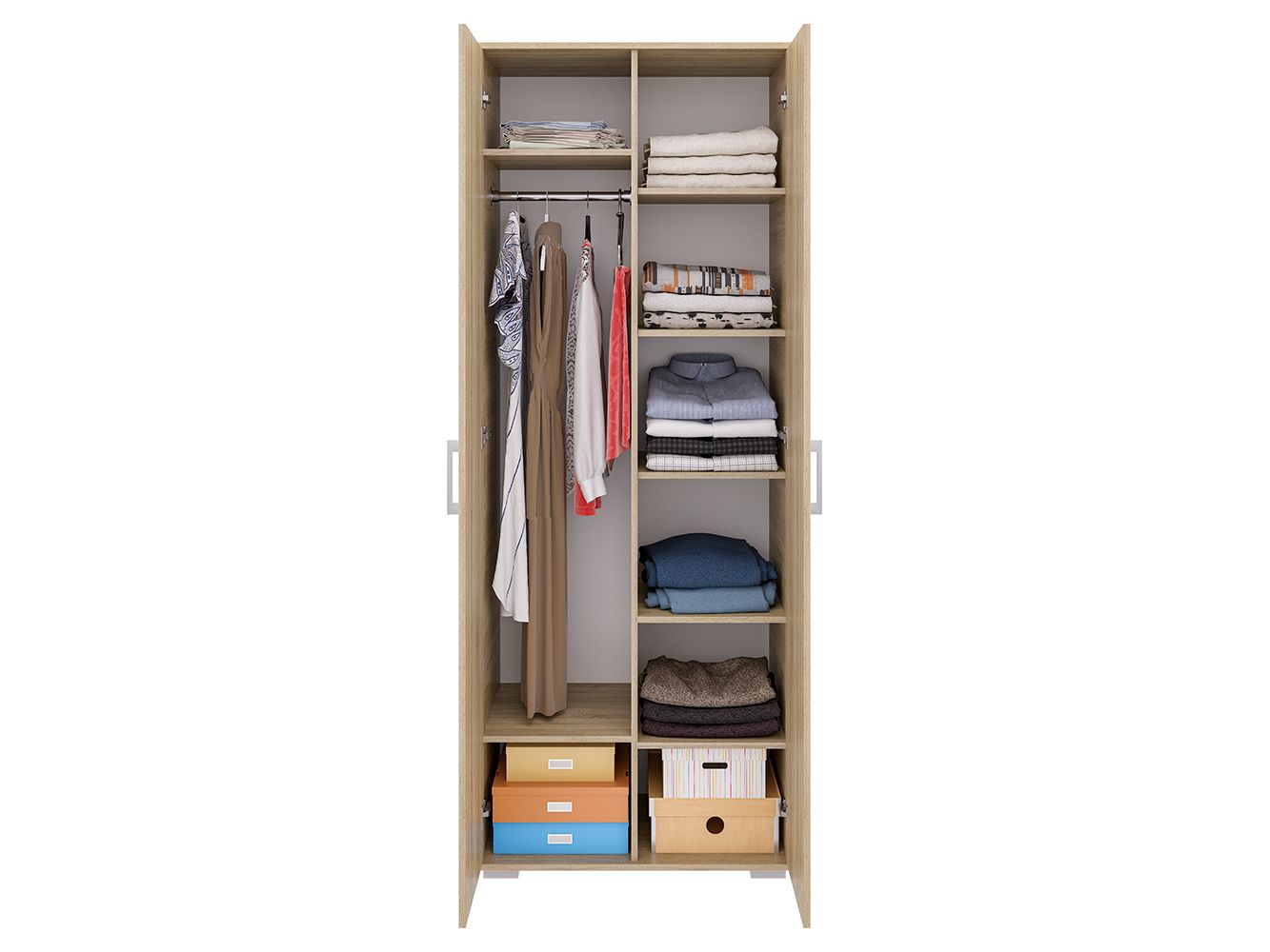 Конструкция включает в себя: семь вместительных полок, две дополнительные ниши, штанга для одежды.