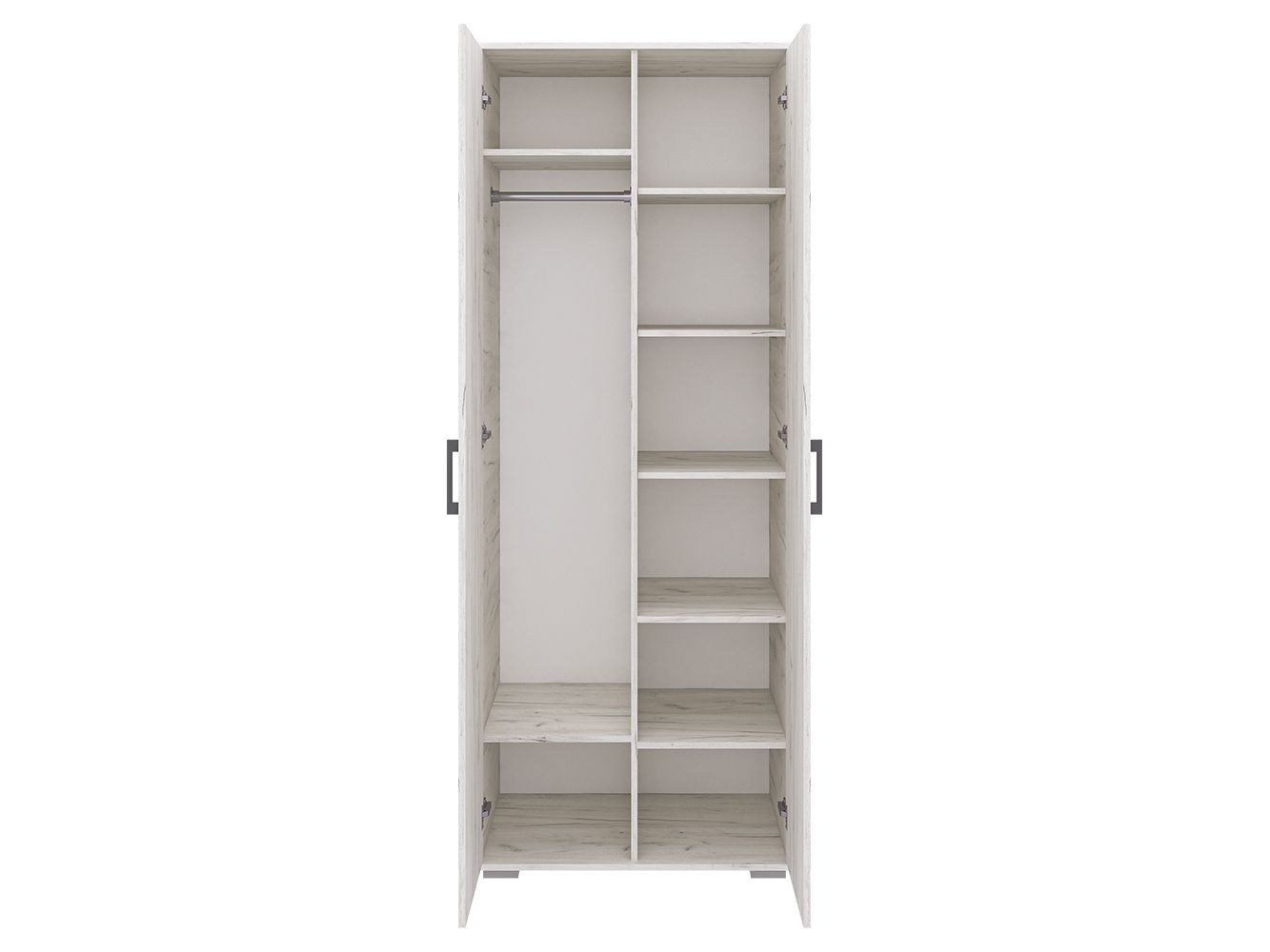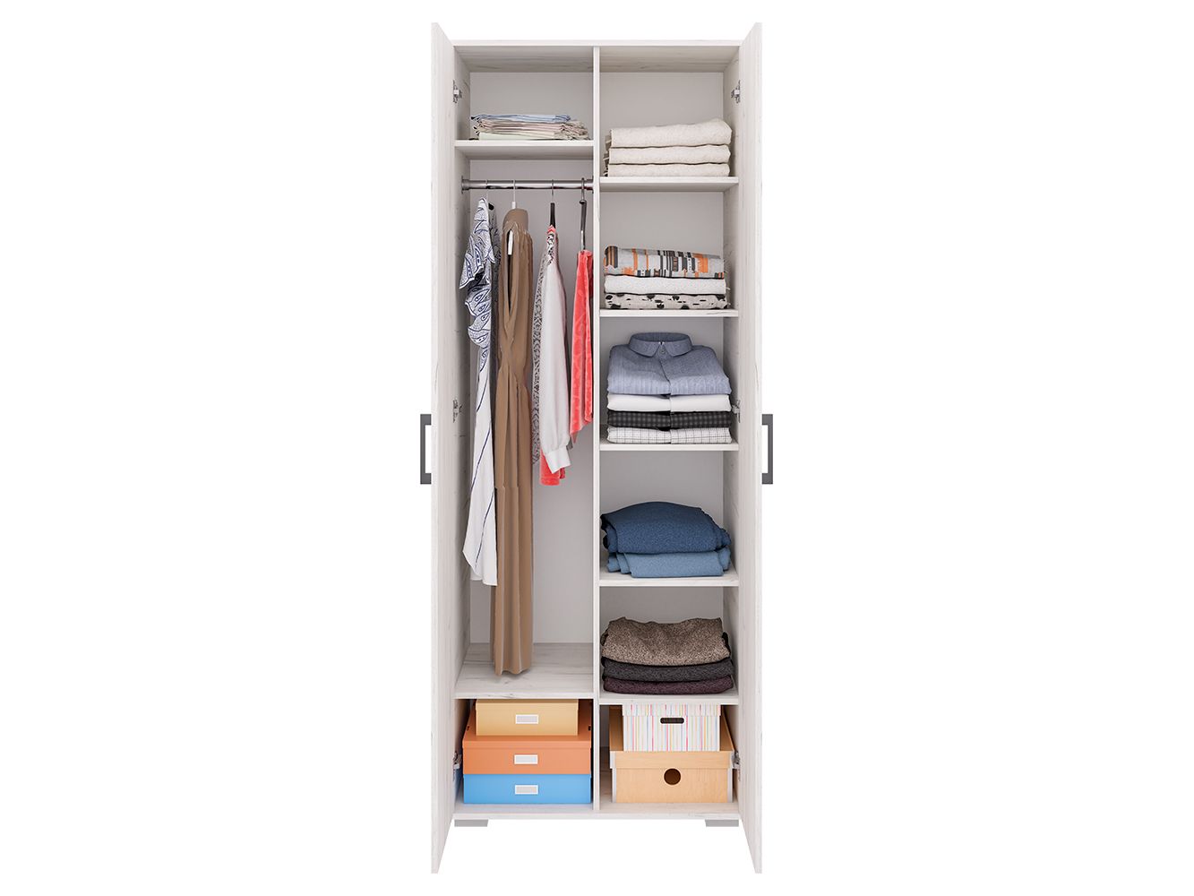 Конструкция включает в себя: семь вместительных полок, две дополнительные ниши, штанга для одежды.