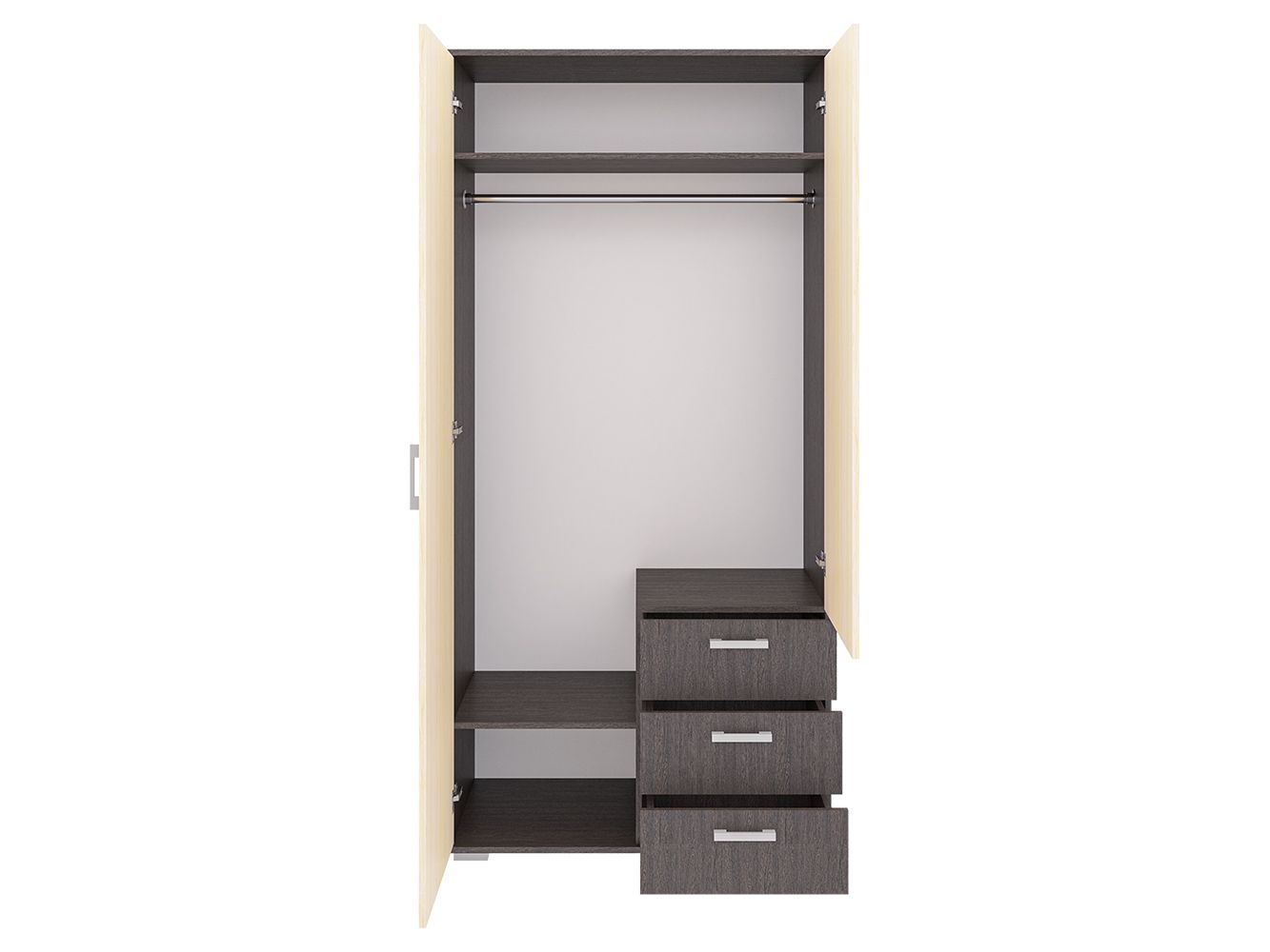 Конструкция включает в себя: вместительная и продольная полка, две ниши, штанга для одежды, стационарная тумба с тремя выдвижными ящиками, зеркало.
