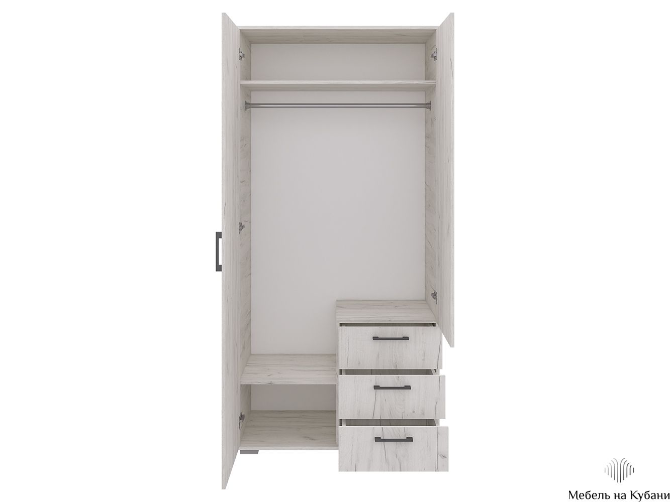 Конструкция включает в себя: вместительная и продольная полка, две ниши, штанга для одежды, стационарная тумба с тремя выдвижными ящиками, зеркало.