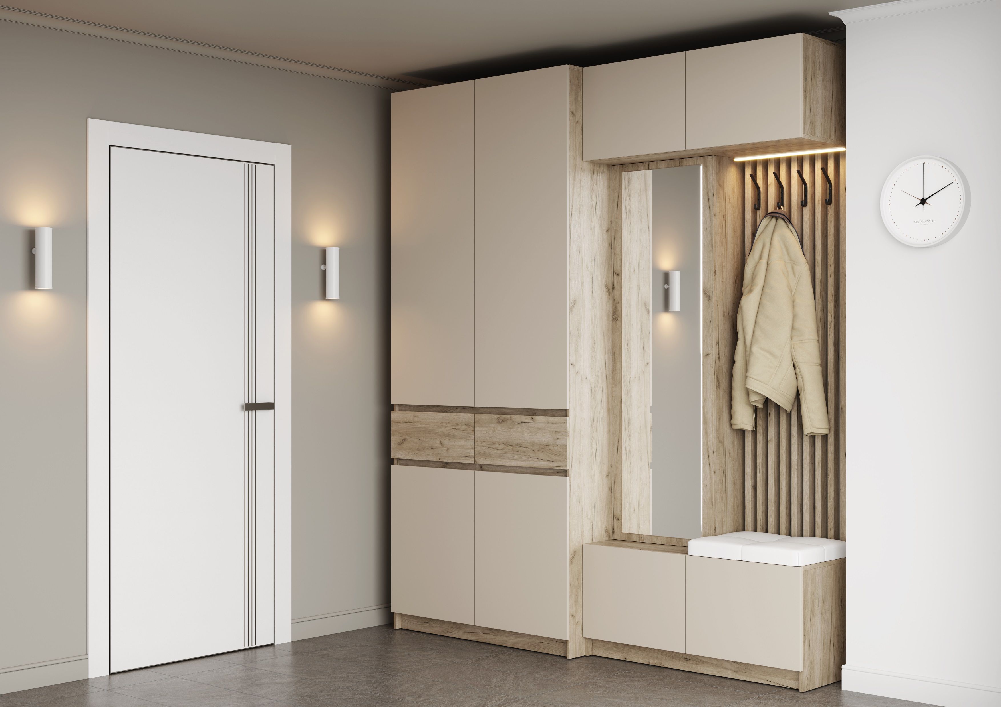 Выполненная в скандинавском стиле прихожая «Бостон» состоит из навесной антресоли, вместительной напольной тумбы, шкафа-пенала с зеркалом, а также из стильной стенки-вешалки, выполненной из профилей. Гарнитур «Бостон» - находка для небольших прихожих.