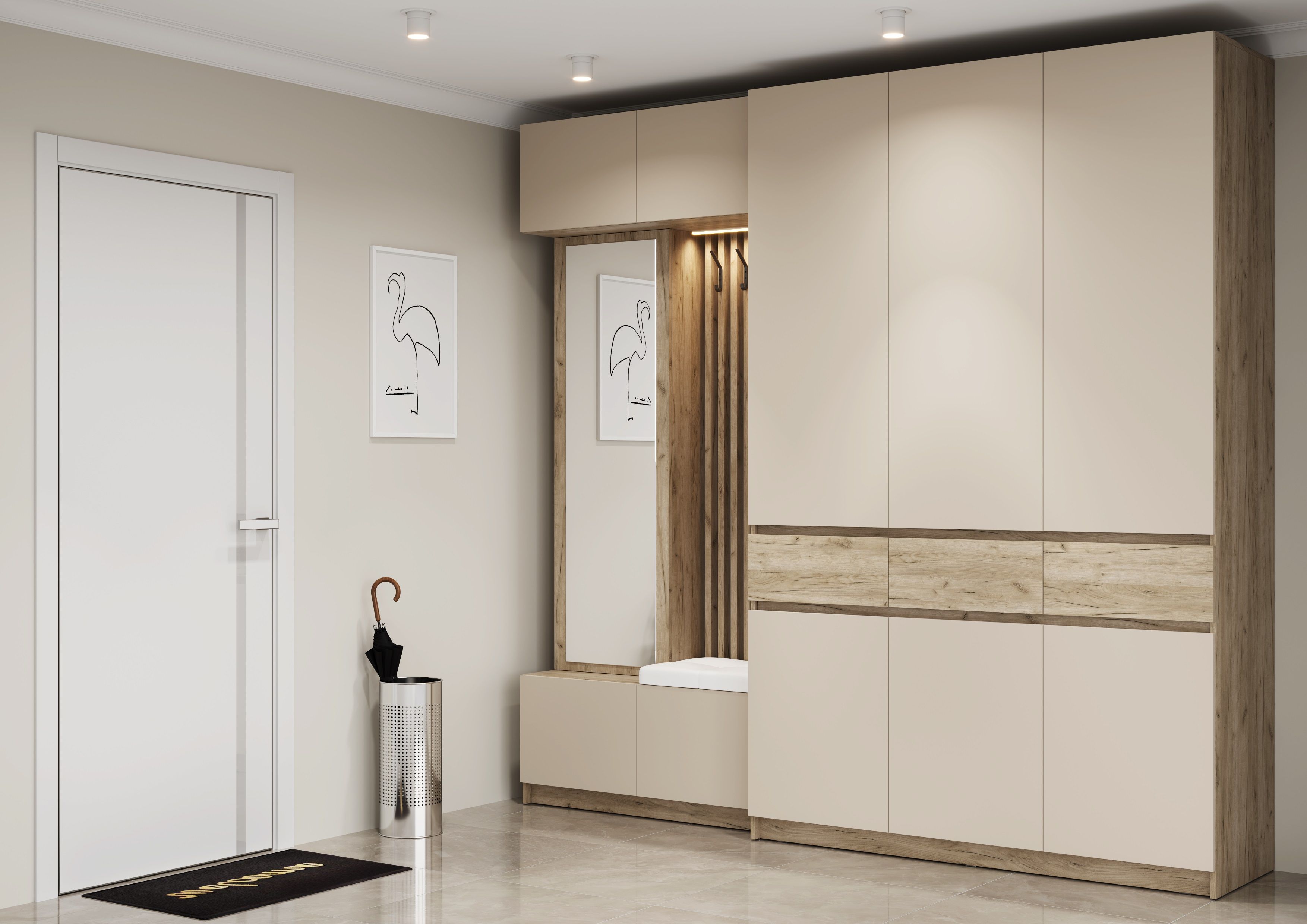 Цвет МДФ профилей Дуб крафт золотой. Соединяются антресоль, пенал и тумба на межсекционные стяжки. МДФ-профили крепятся на евростяжки. Все створки без ручек,открывание с помощью отталкивателя для двери( TITUS). Сборка прихожей УНИВЕРСАЛЬНАЯ.