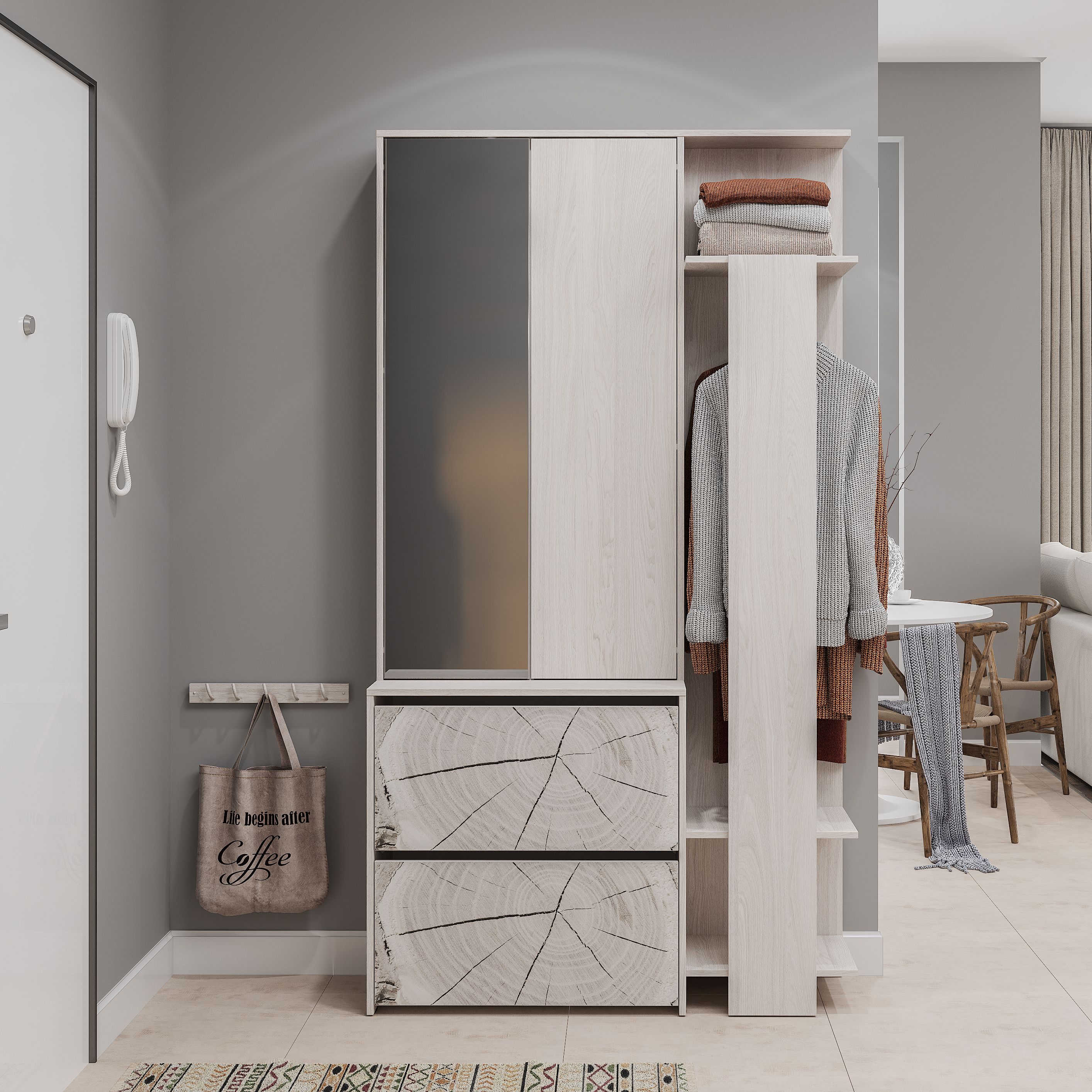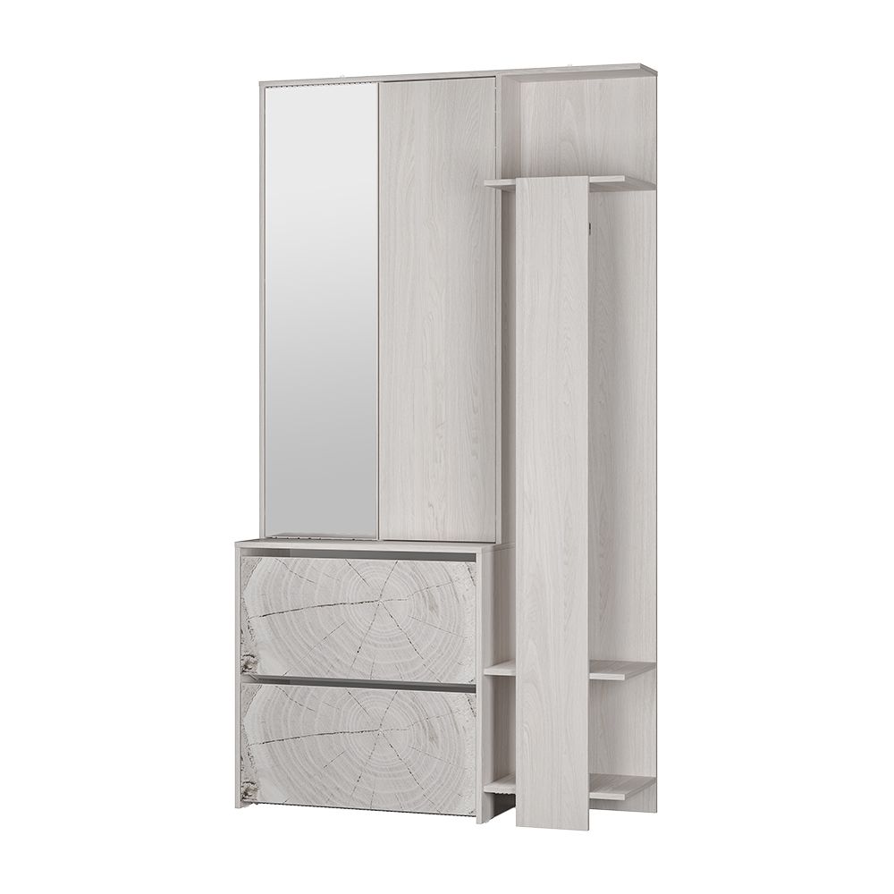 Прихожая "Россо" - модель, созданная для тех, кто ценит многофункциональность. "Россо" объединяет в себе все необходимые элементы прихожей: светлый цвет корпуса органично дополняет фасад с фотопечатью, имитирующей спил дерева.