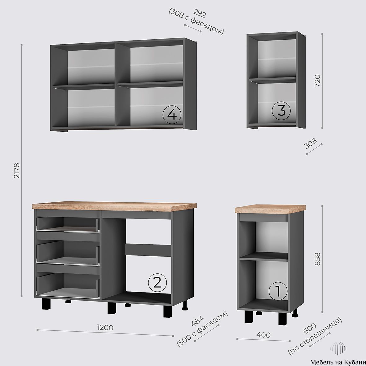 Размеры низ: ширина - 1602 мм, высота - 858 мм, глубина - 600 мм. Размеры верх: ширина - 1600 мм, высота - 720 мм, глубина - 308 мм.