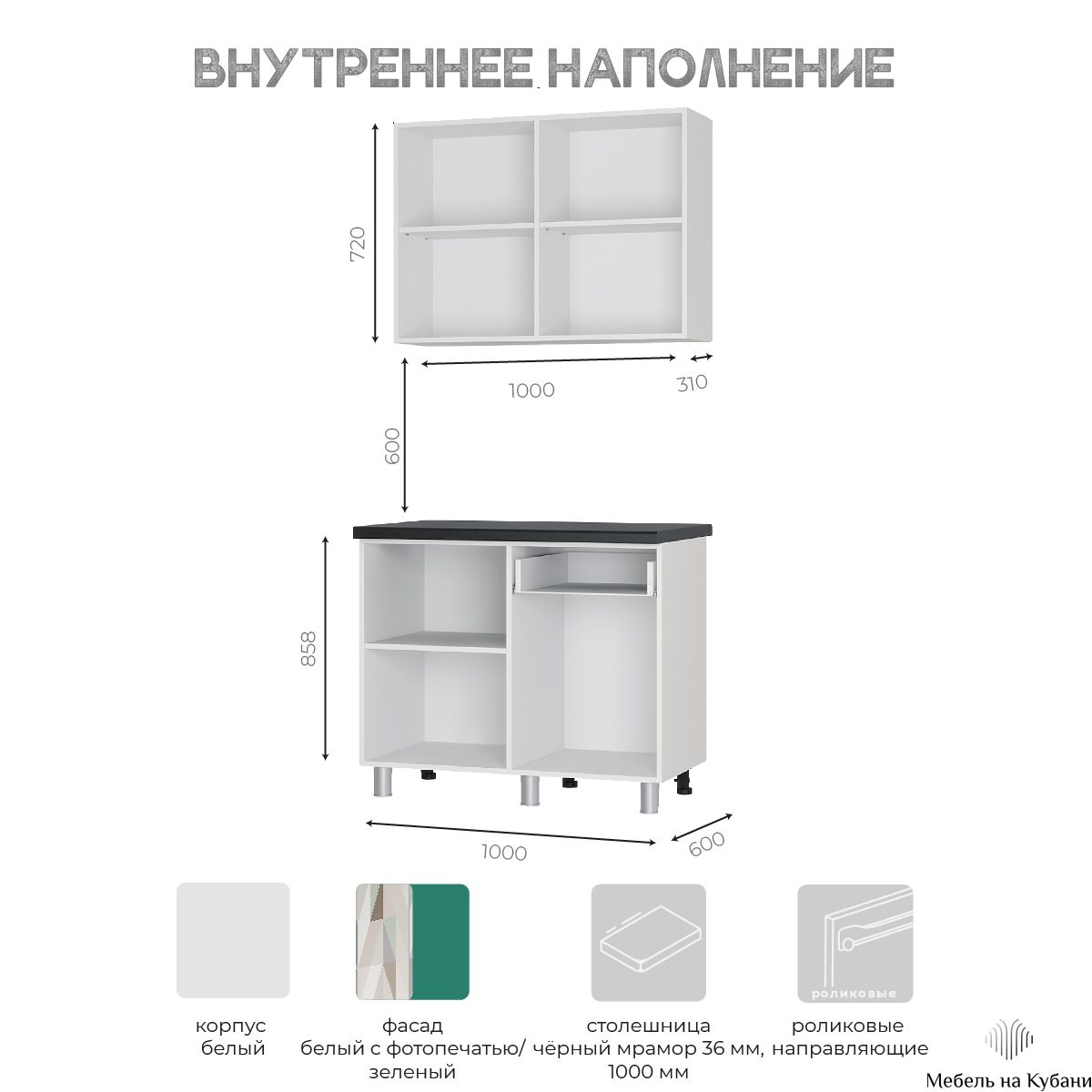 Нижний модуль: 1ОР2, высота - 858 мм (без опор), глубина - 600 мм.