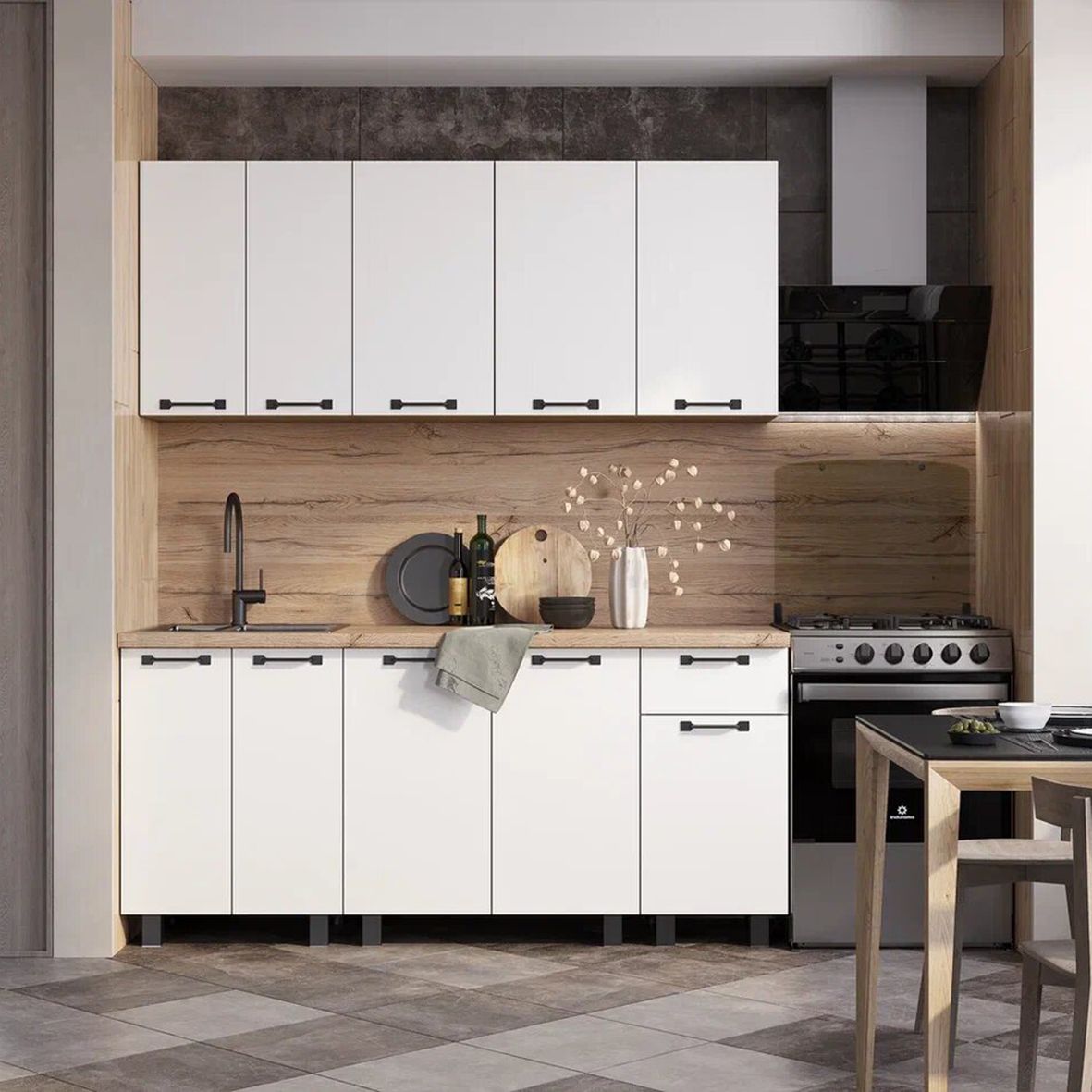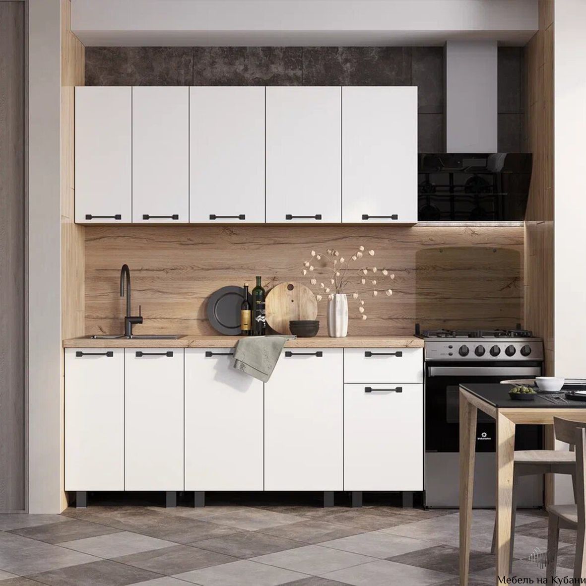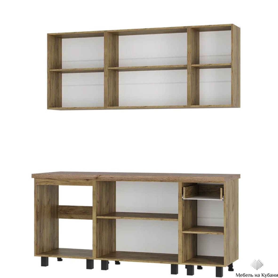 Комплектуется цельной столешницей размером 1,8 м, толщиной 38 мм, декор - дуб кера.