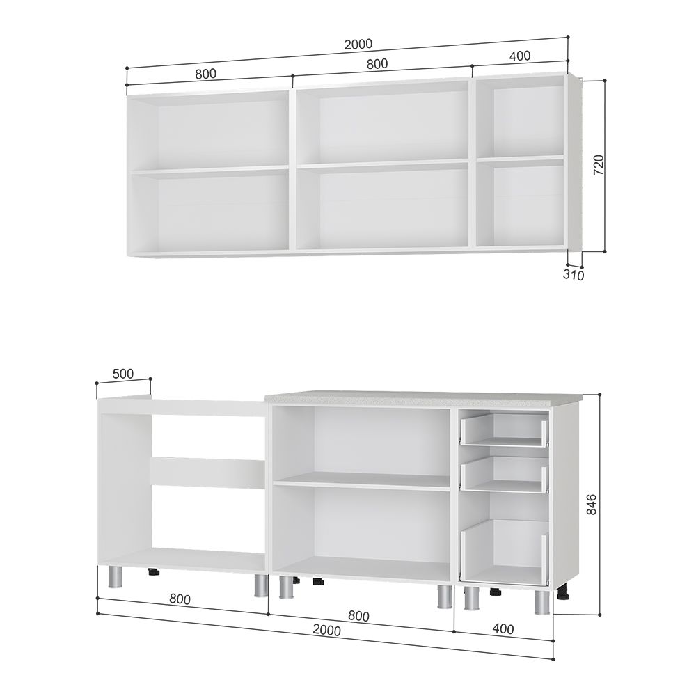 Габаритные размеры композиции нижних модулей с учётом столешницы: ширина: 2000 мм, высота: 846 мм, глубина: 600 мм.
