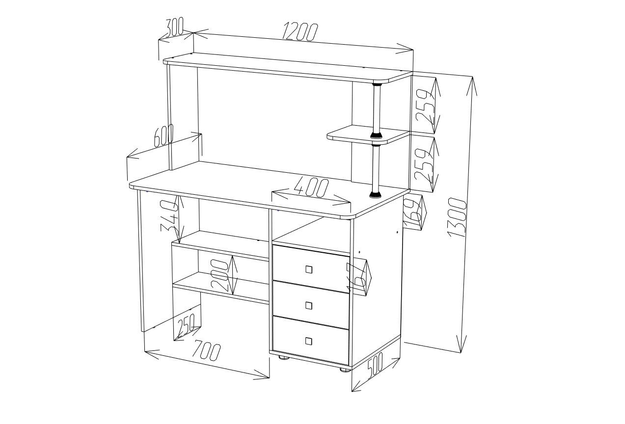 Лаконичность и функциональность при обязательном и безупречном качестве. Оснащение: широкая столешница с местом под монитор 534х870мм, четыре полноценные полки, стационарная тумба с тремя ящиками полного выдвижения и открытой нишей, края сглажены для комфортного пользования, на фасадах используются фигурные ручки, регулируемые опоры компенсируют возможные неровности пола.