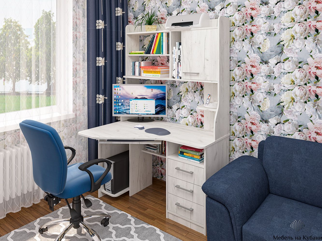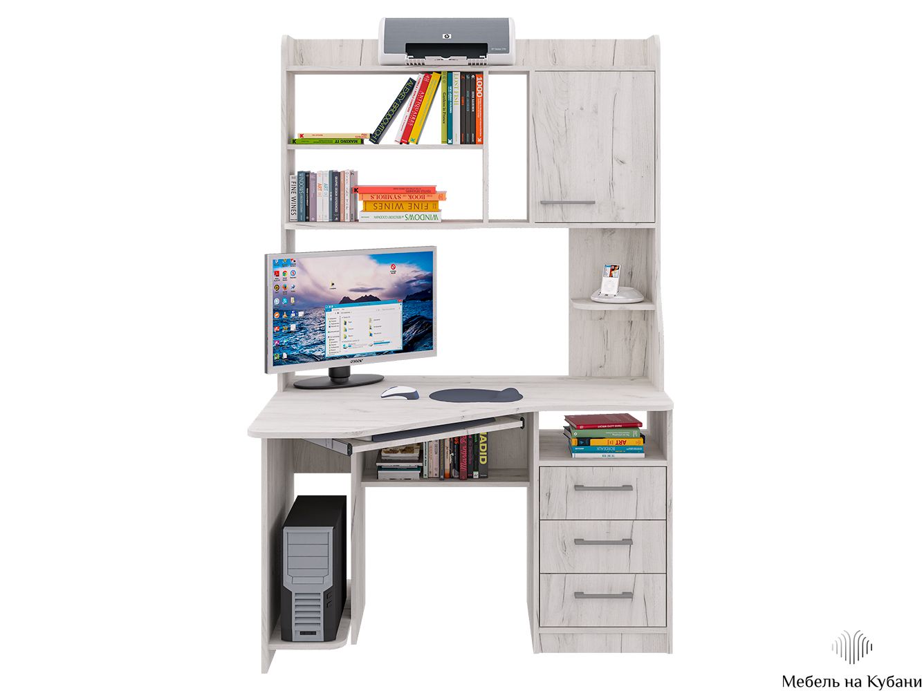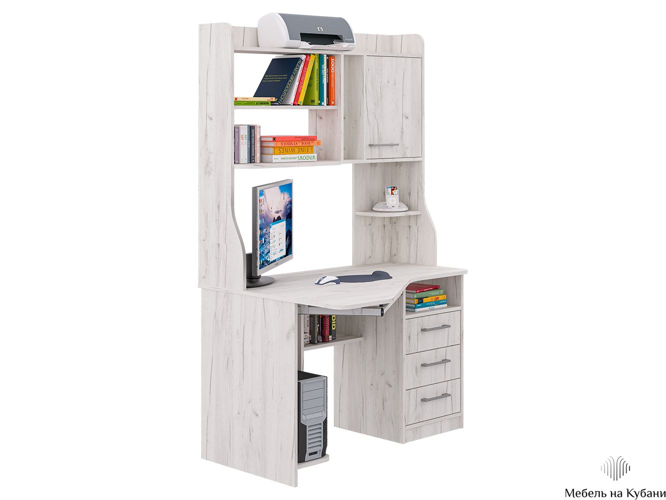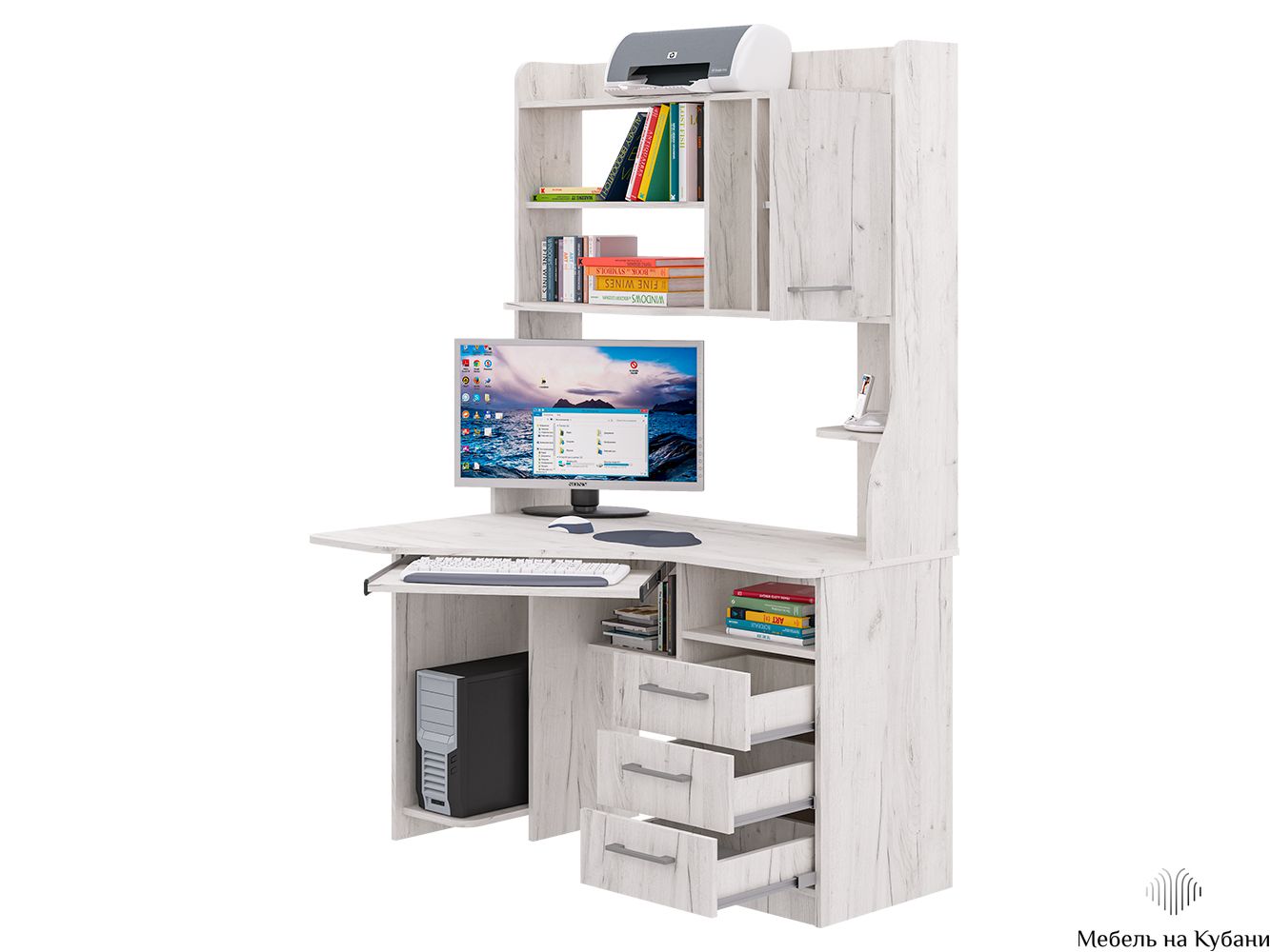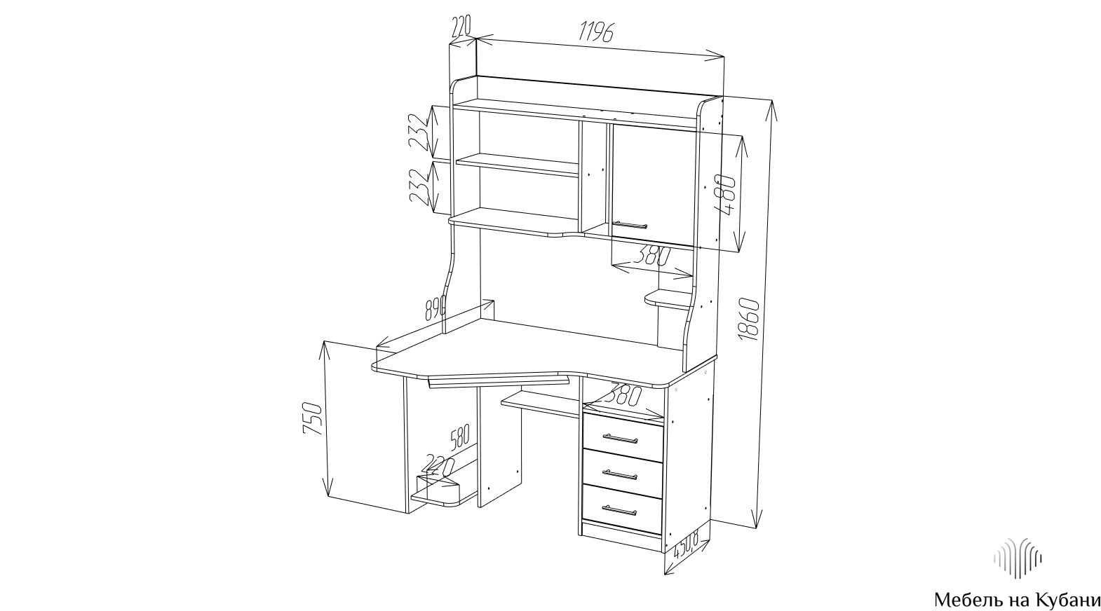 Функциональная угловая модель оснащена: фигурной столешницей, тремя ящиками полного выдвижения (шариковые направляющие), полкой под системный блок и клавиатуру, семь открытых ниш, распашной шкафчик c двумя 2 полками. Размер под монитор 502х906, края сглажены для комфортного пользования.