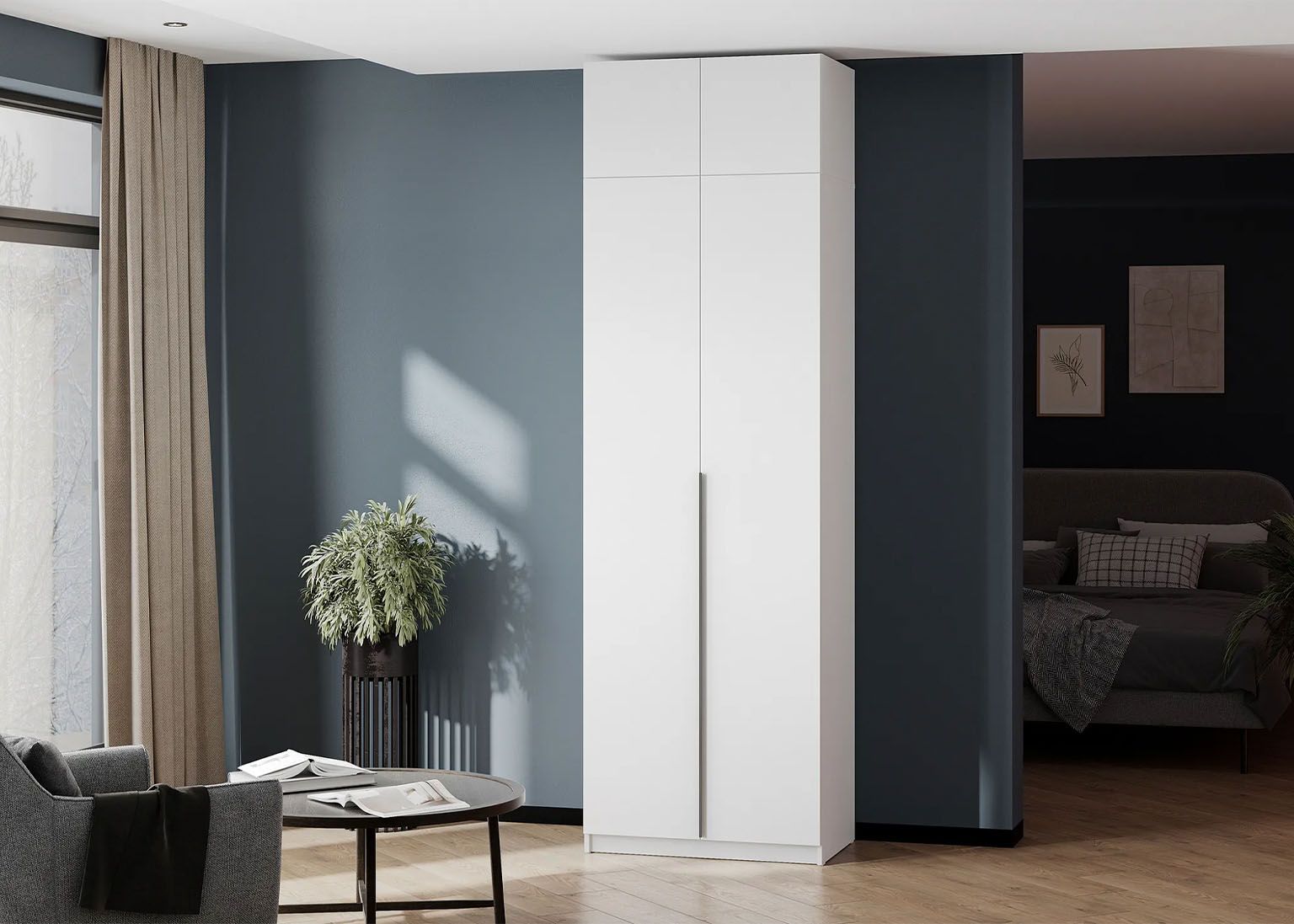 Дополнительные опции включают комплект полок и комплект ящиков, что позволяет настроить шкаф в соответствии с вашими потребностями. Вы можете установить до двух ящиков одновременно. Для наилучшей организации пространства и скрытия содержимого верхнего ящика мы рекомендуем также приобрести комплект полок. Все дополнительные элементы приобретаются отдельно, что даёт вам возможность гибко подходить к выбору конфигурации шкафа.