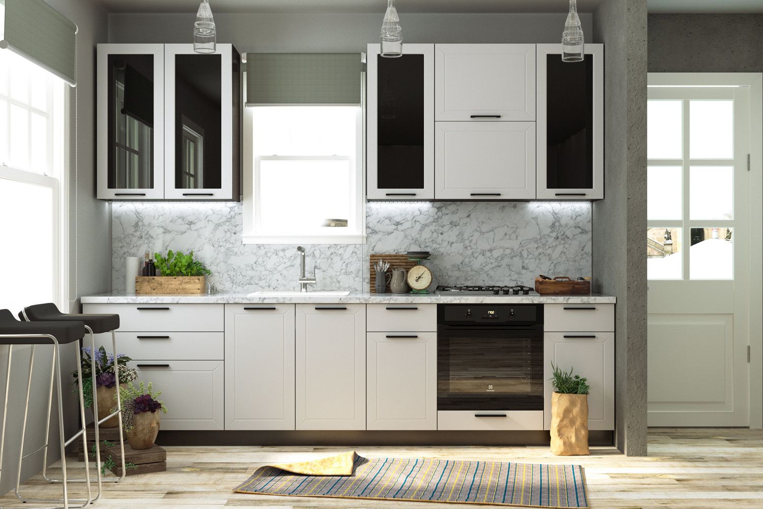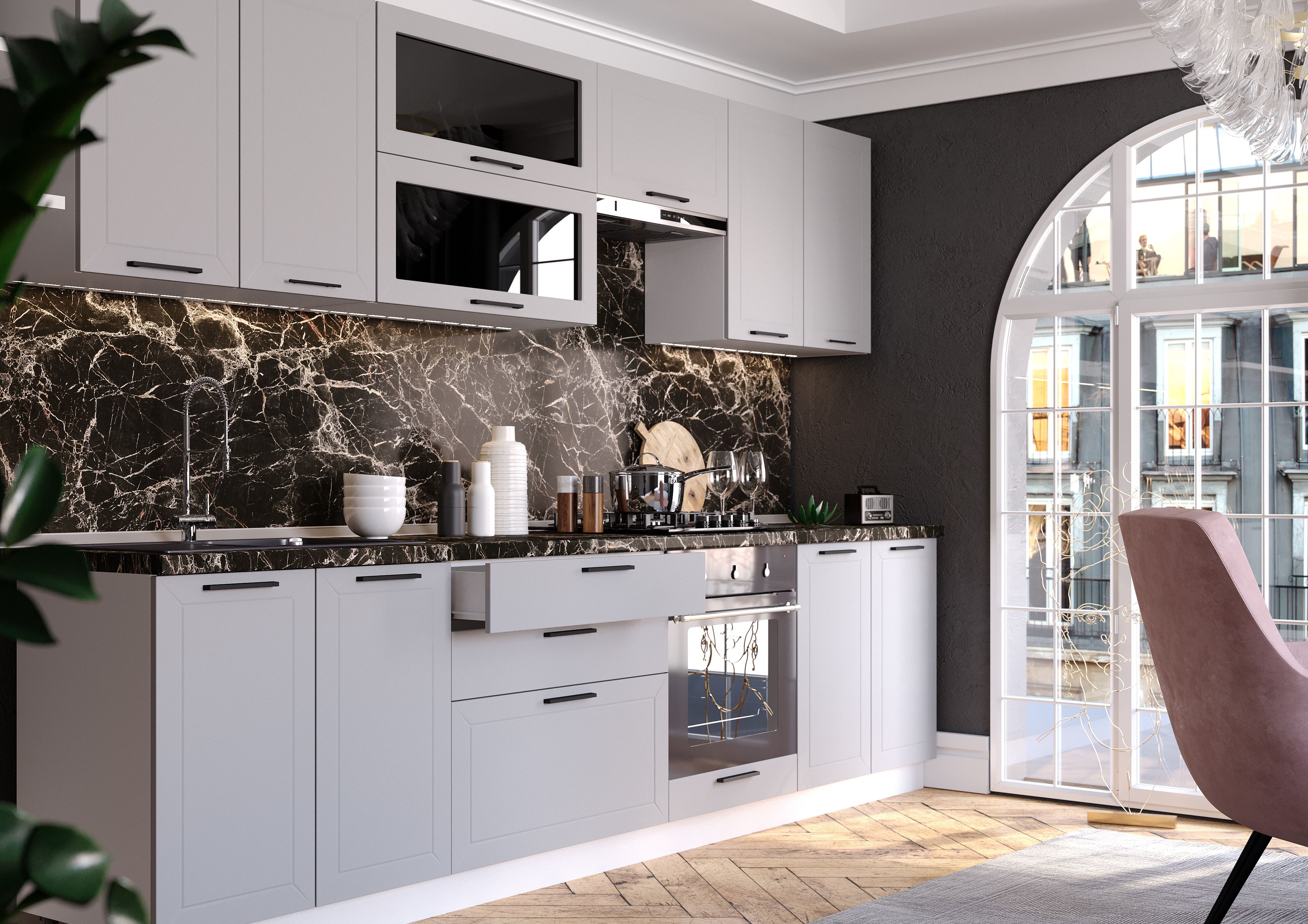 Изысканная текстура создает ощущение роскоши и уюта. Тончайшие линии фасада подчеркивают элегантность дизайна. Суперстильные черные матовые ручки добавляют кухне современности и строгости. Чёрные стёкла придают гарнитуру драматизма и глубины.