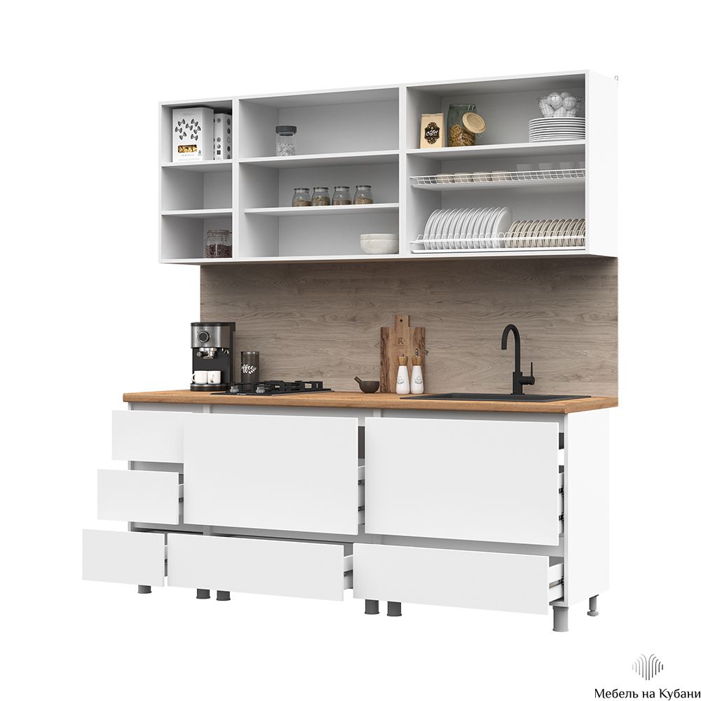 - Нижние модули шириной по 800 мм., один из которых предназначен под мойку имеют крупные выдвижные ящики, имеет место под мойку и вместительную секцию с полкой для крупной посуды или кухонной техники.
