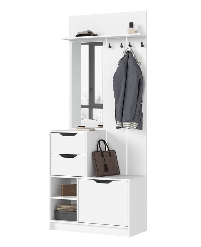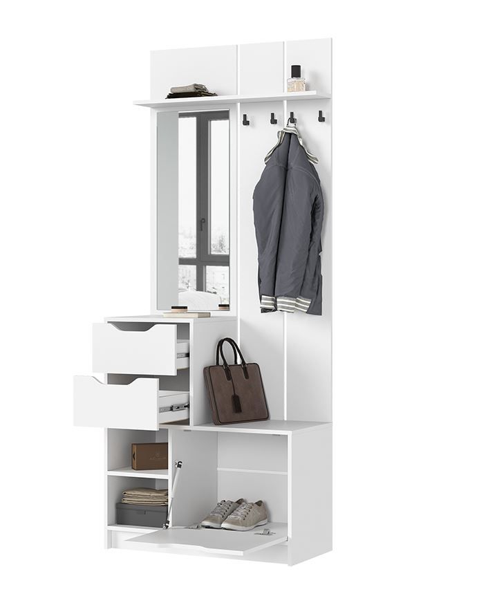 Прихожая состоит из верхней полки, секции с зеркалом и крючками, двух выдвижных ящиков, обувницы и открытых полок.