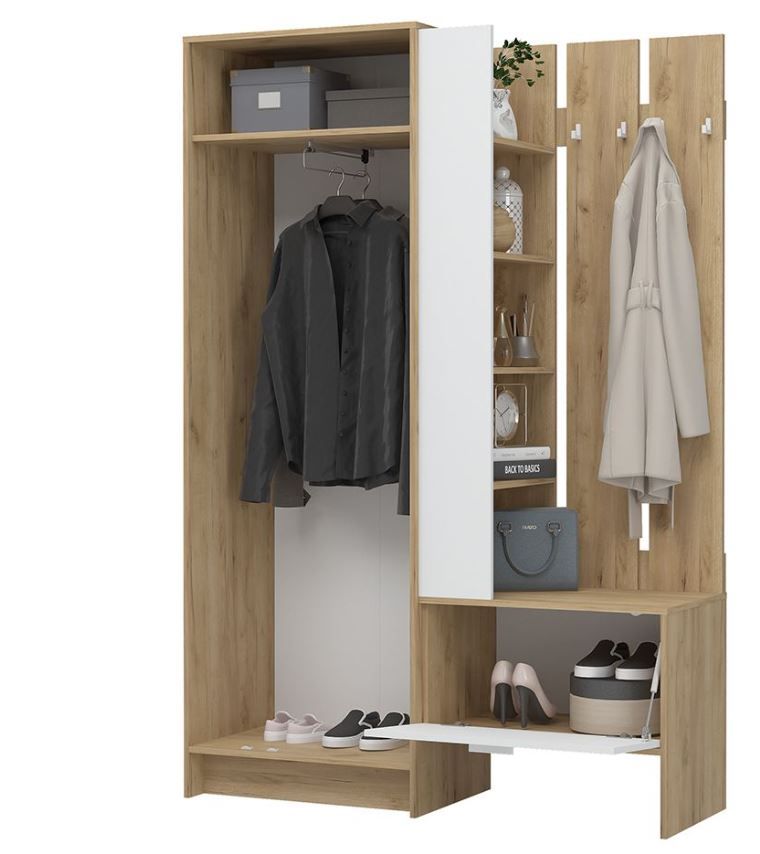 ИРИС ПР-01 Прихожая (1350х2000х455). Коллекция Ирис, соединила в себе современную динамику модерна и простые конструктивные решения, самым неожиданным образом оказался на вершине популярности в настоящее время. Коллекция "ИРИС" выглядит живо и задорно, имеет свои особенности и настроение. Упор в ней делается на максимально комфортную домашнюю атмосферу. Коллекция ИРИС, как легкая акварель, написана в сочетании корпуса солнечного древесного декора ЛДСП «Дуб Крафт Золото» и фасадов в классическом пастельном тоне ЛДСП «Белый Шагрень». Светлые фасады утоплены внутрь яркого корпуса, что создает их контрастное обрамление
