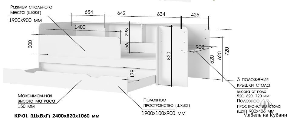 Ширина2400 ммВысота820 ммДлина1060 ммДлина спального места1,9 мЦветБелый