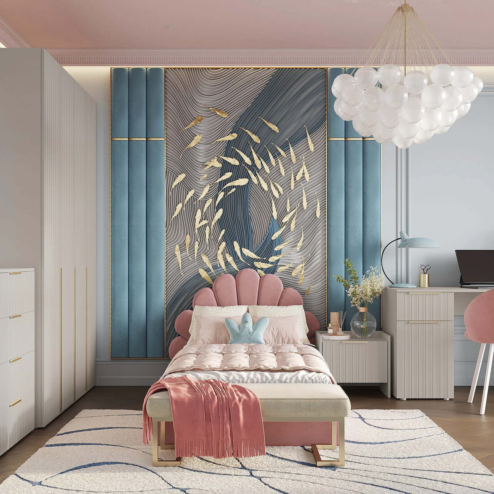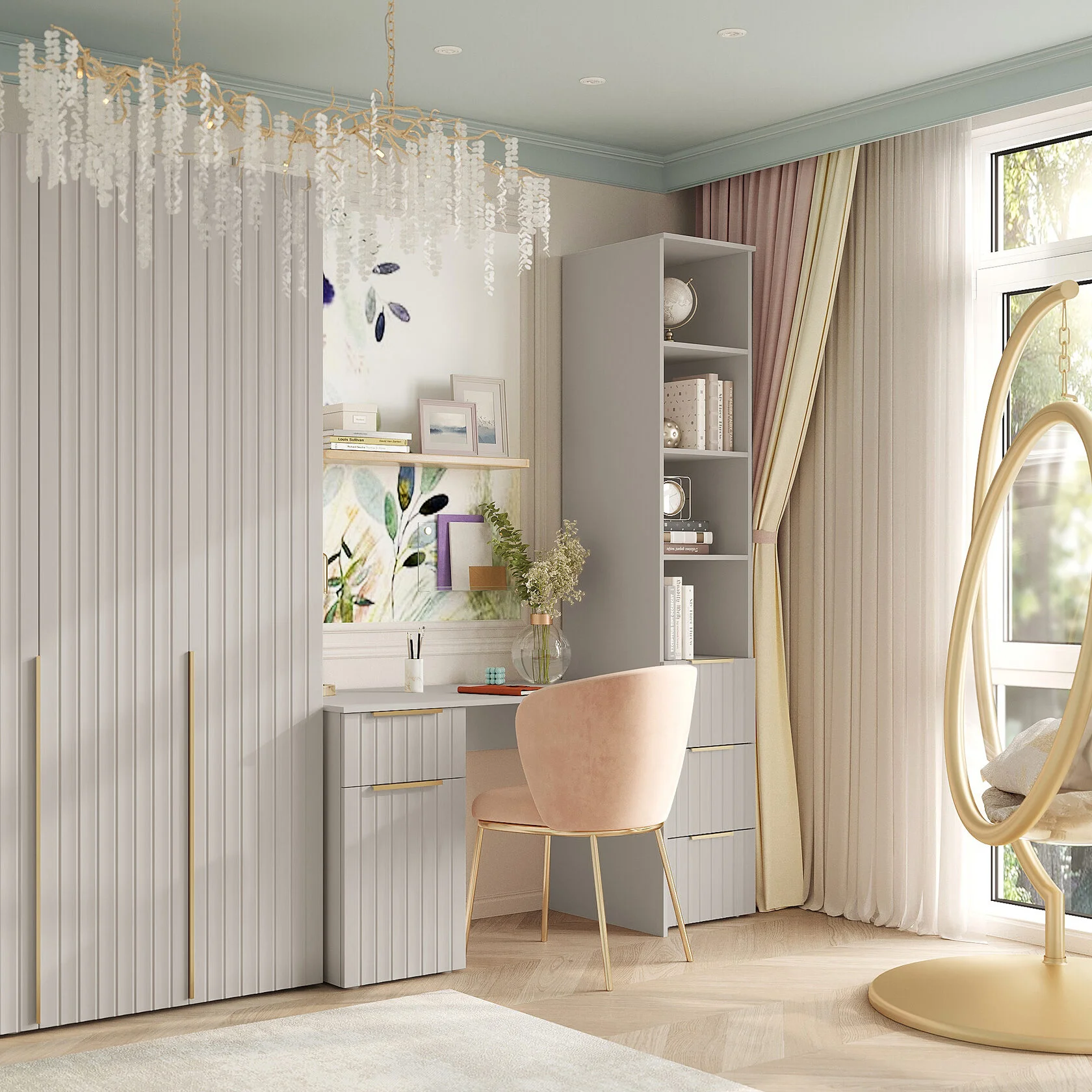 Светлый корпус и фрезерованные фасады, украшенные золотистой фурнитурой, прекрасно подойдут для интерьеров различных стилей. Лаконичный и светлый дизайн украшают тонкие ручки в цвете «золото». Интерьер комнаты также можно дополнить другими предметами мебели из коллекции Тефия.