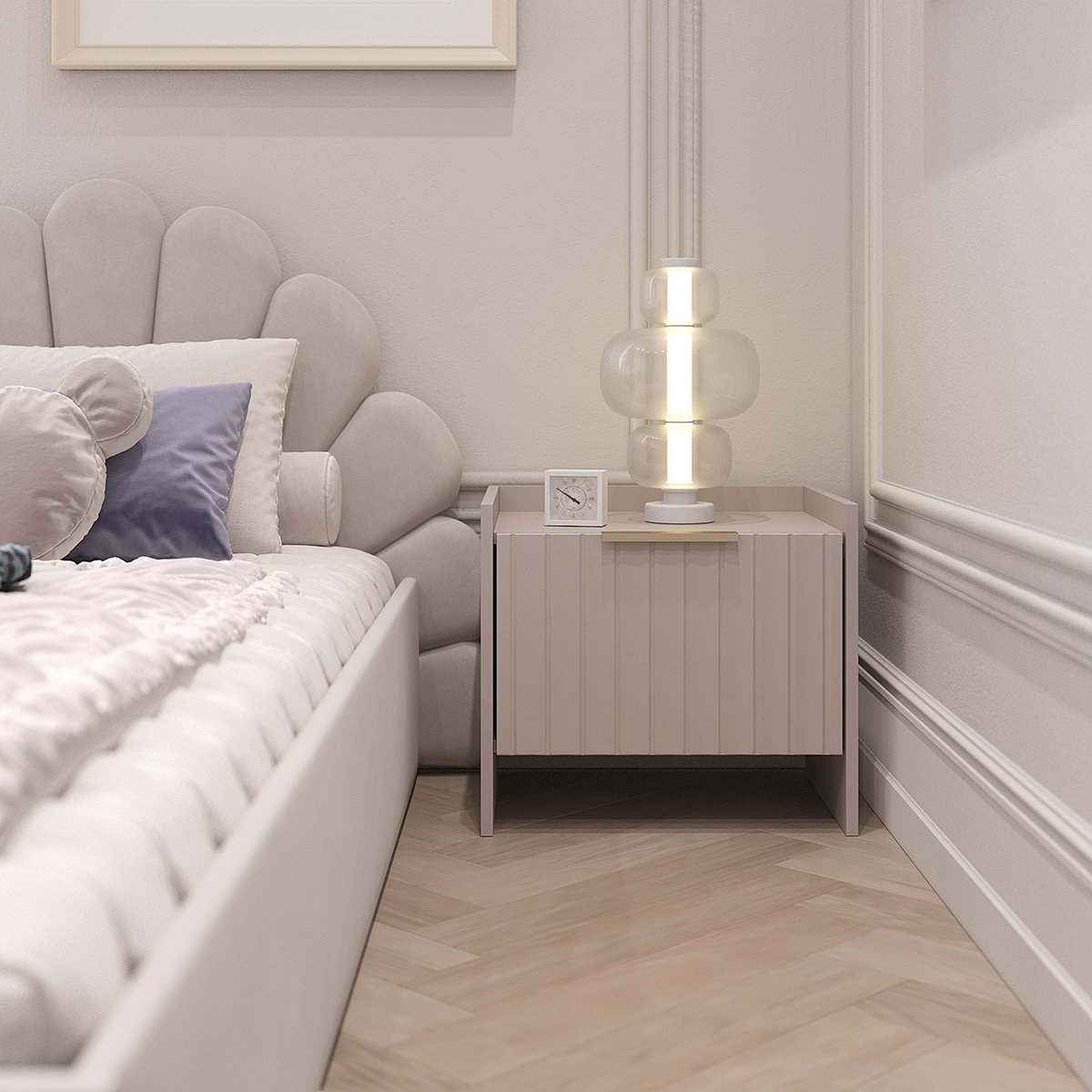Тумба прикроватная Тефия с дизайнерскими 3Д фасадами сочетает в себе функциональность и эстетическую привлекательность. Тумба предназначена для хранения мелких предметов, которые могут понадобиться рядом с кроватью, таких как книги, часы, лампа, лекарства или телефоны.