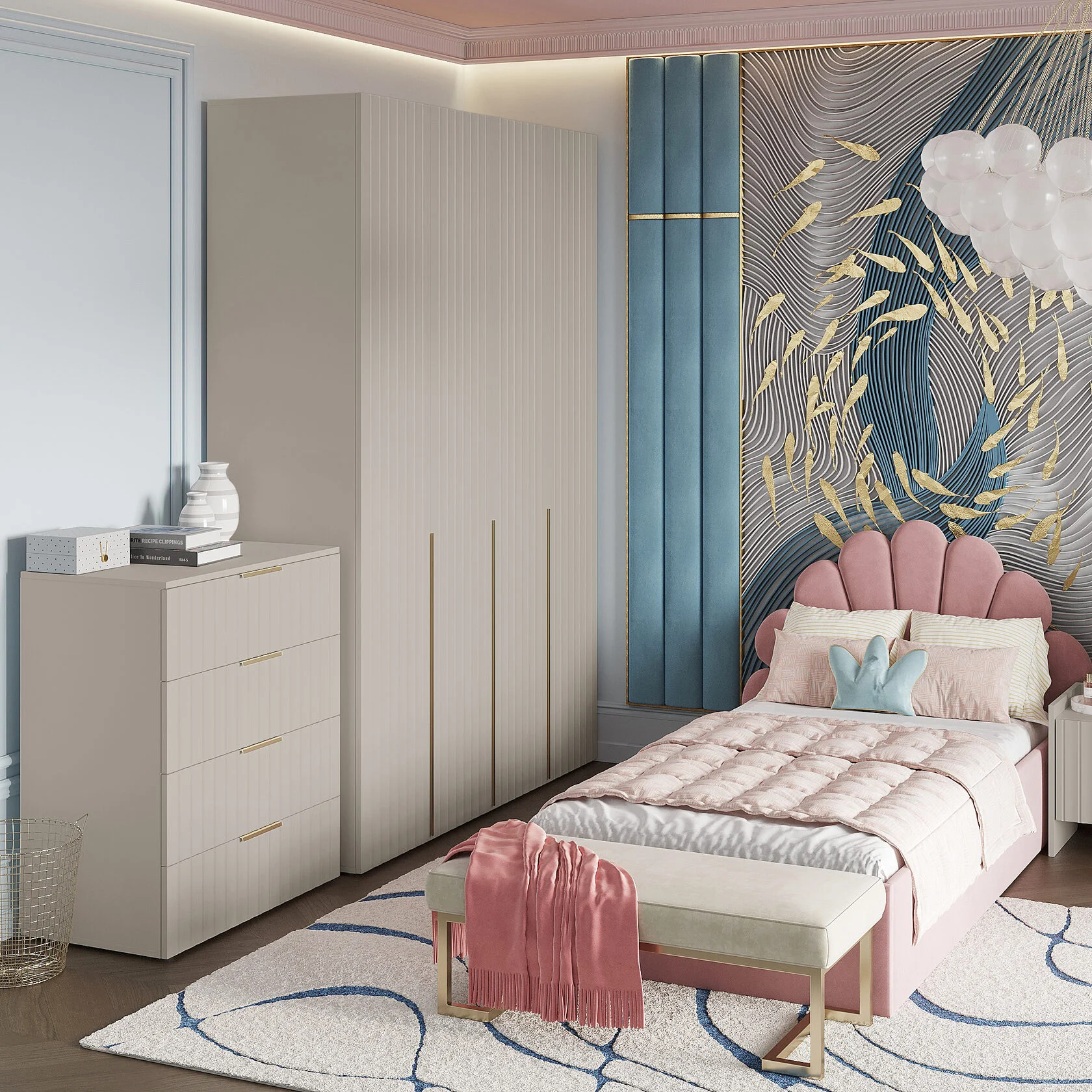 Светлый корпус и фрезерованные фасады, украшенные золотистой фурнитурой, прекрасно подойдут для интерьеров различных стилей. Лаконичный и светлый дизайн украшают тонкие ручки в цвете «золото». Интерьер комнаты также можно дополнить другими предметами мебели из коллекции Тефия.