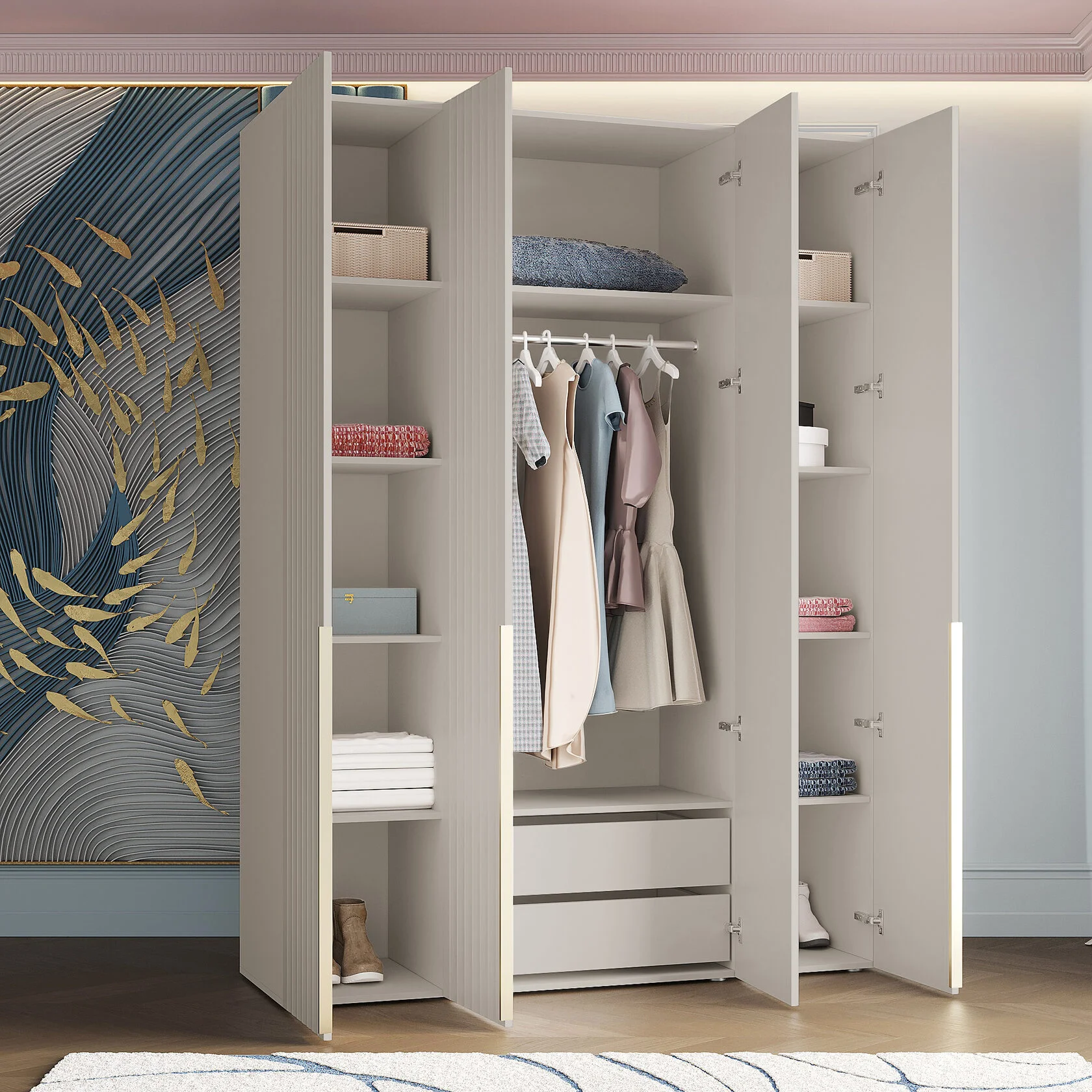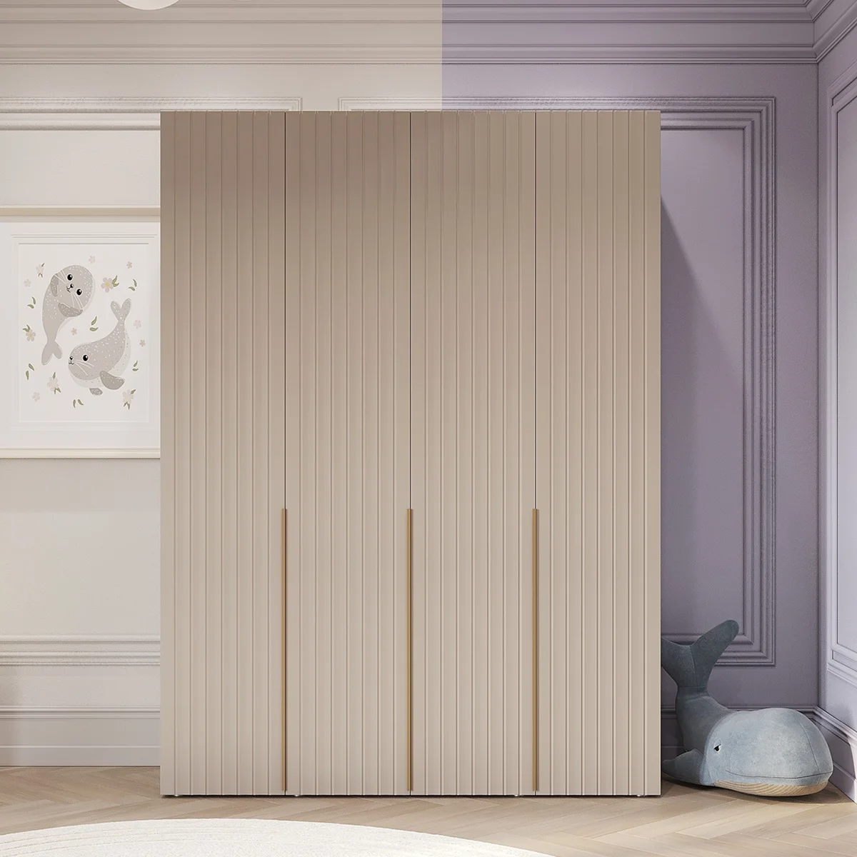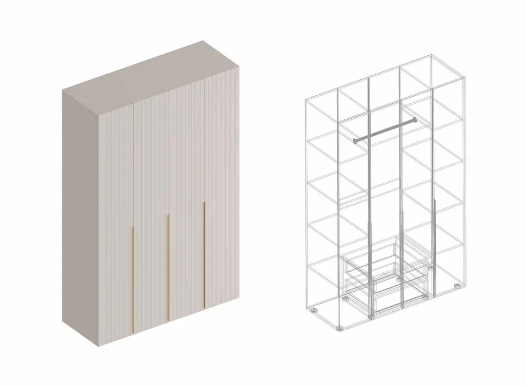 Шкаф четырехстворчатый для одежды Тефия с дизайнерскими 3Д фасадами сочетает в себе функциональность и эстетическую привлекательность, идеален для использования в различных помещениях, таких как спальня, детская комната гостиная или прихожая.