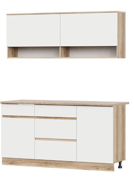 Кухонный гарнитур, состоящий из одного напольного и одного навесного модулей. Напольный модуль представляет собой комбинированный стол шириной 1600мм. В центральной части отсек с тремя выкатными ящиками на шариковых направляющих. По сторонам от него расположен отсек с полкой и распашной створкой и отсек для установки мойки с распашной створкой и фальшпанелью. Навесной модуль это шкаф шириной 1600мм с 2мя барными створками на газлифтах, за которыми расположены отсеки для хранения, под ними 2 открытые ниши.
