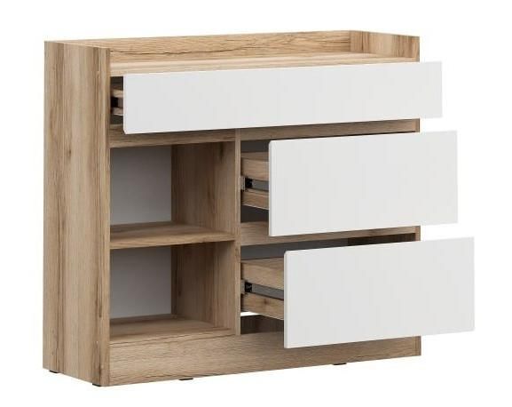 Удобные ящики обеспечат легкий доступ ко всем необходимым вещам, а крепкая конструкция гарантирует долгий срок службы изделия. Комод оборудован тремя выкатными ящиками на шариковых направляющих полного движения. Уникальный конструктив комода заключается в том, что помимо древесных линий, встречных скосах между верхним ящиком и средним ящиком, борта боковин и задней стенки комода подняты.