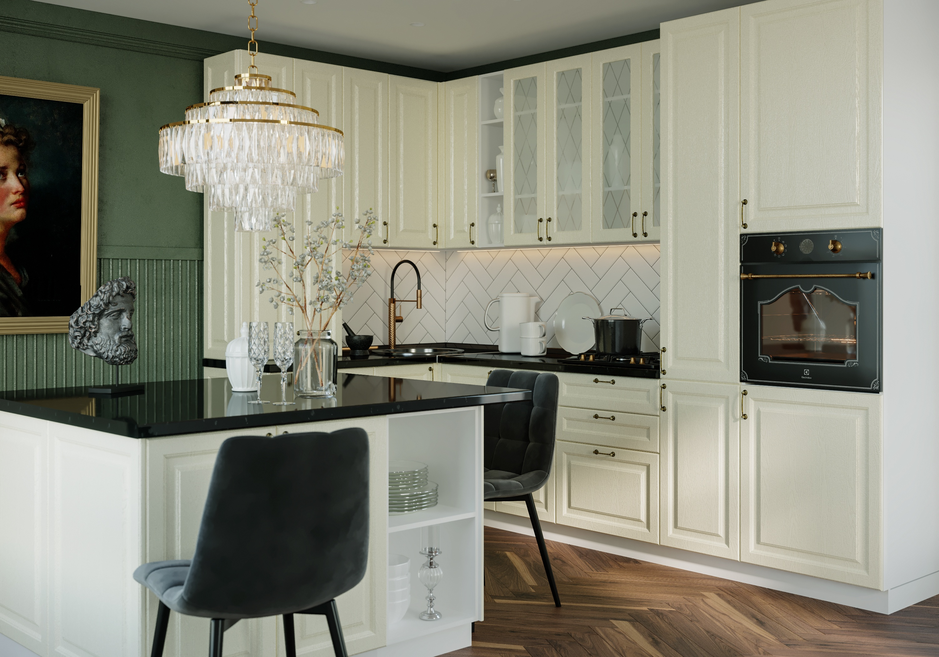 Фурнитура цвета состаренной бронзы с ретро-дизайном добавит кухне «Ницца» аристократический шарм.