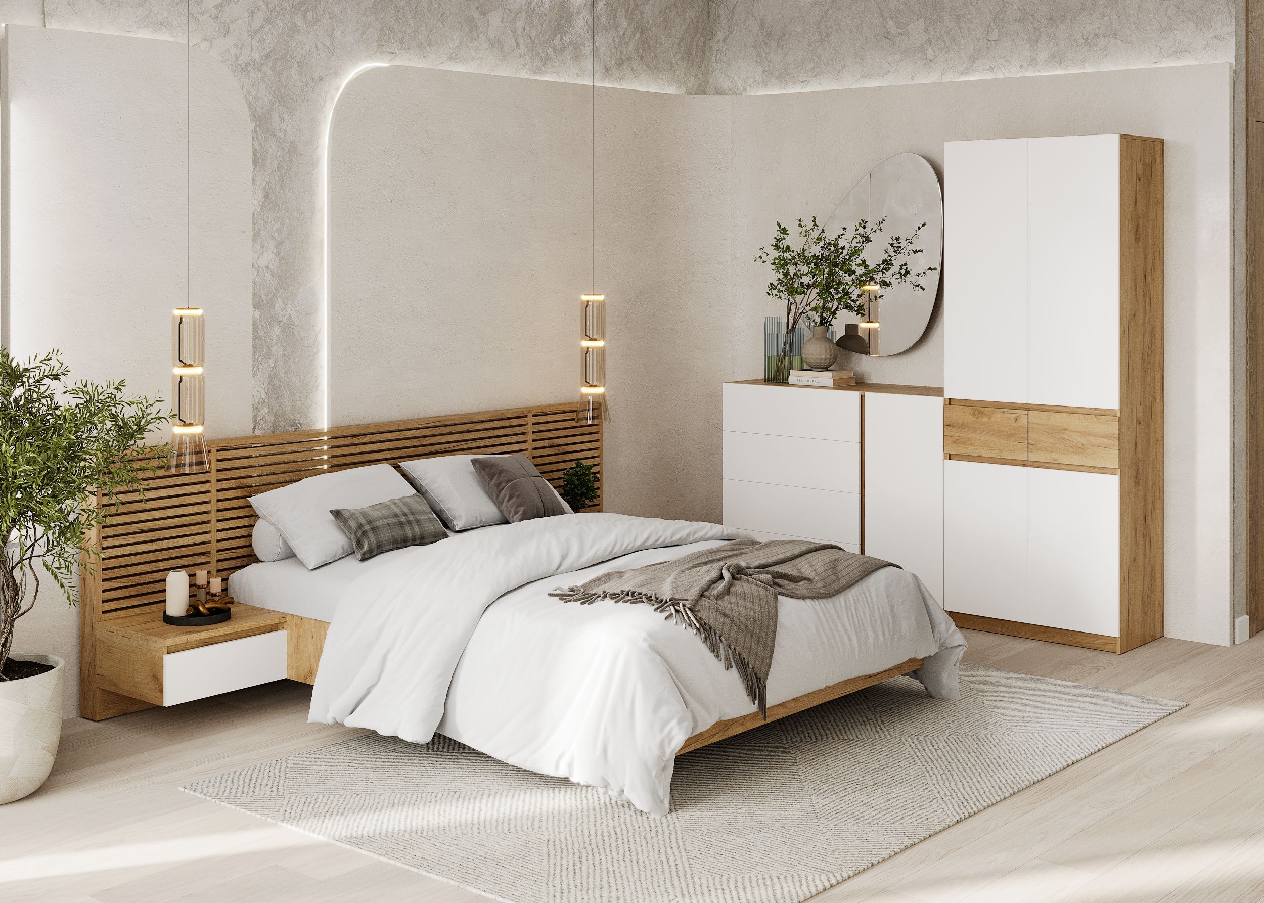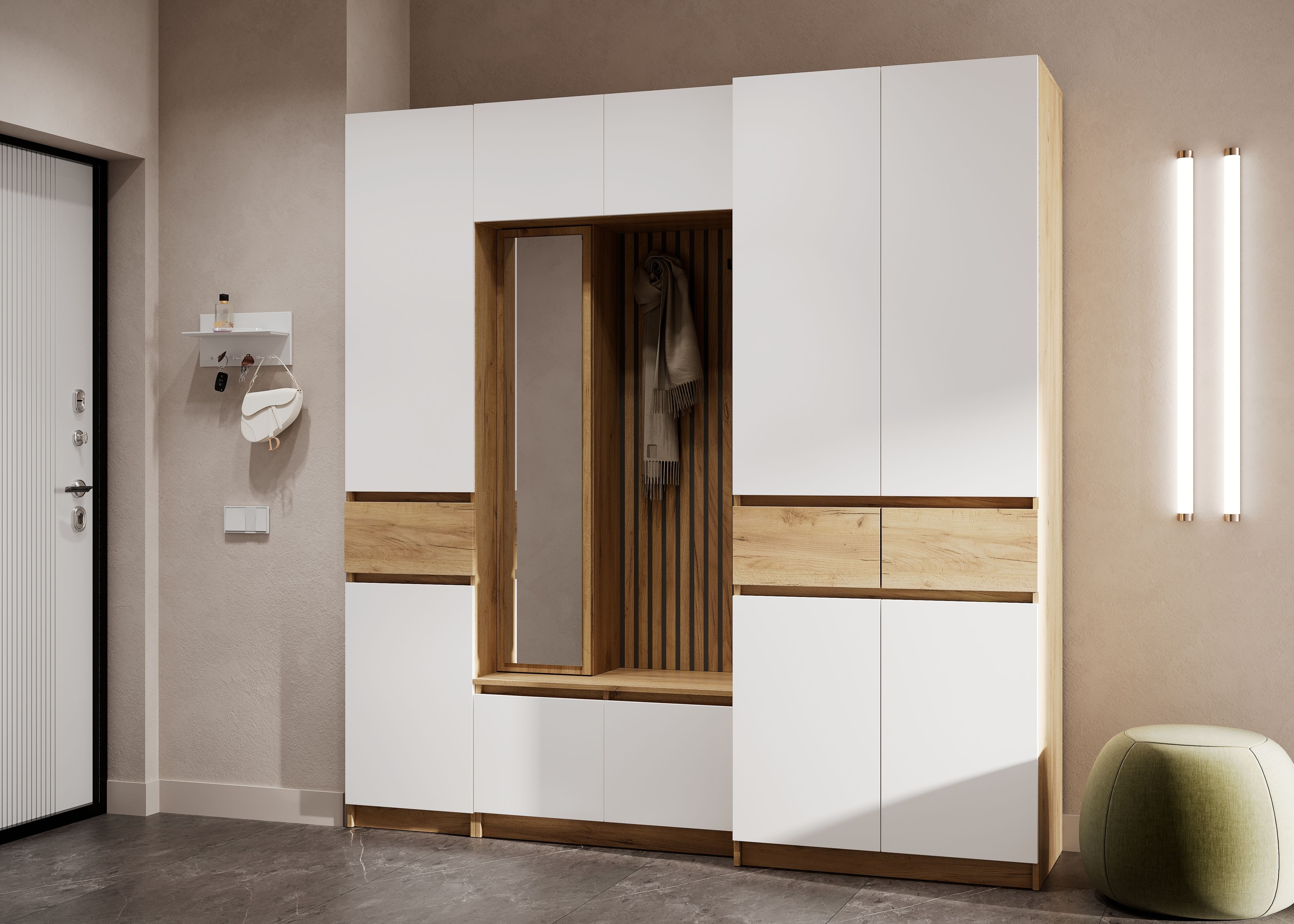 - Фасады без ручек — открываются за фасад (зазоры 30 мм скрыты декоративными планками).