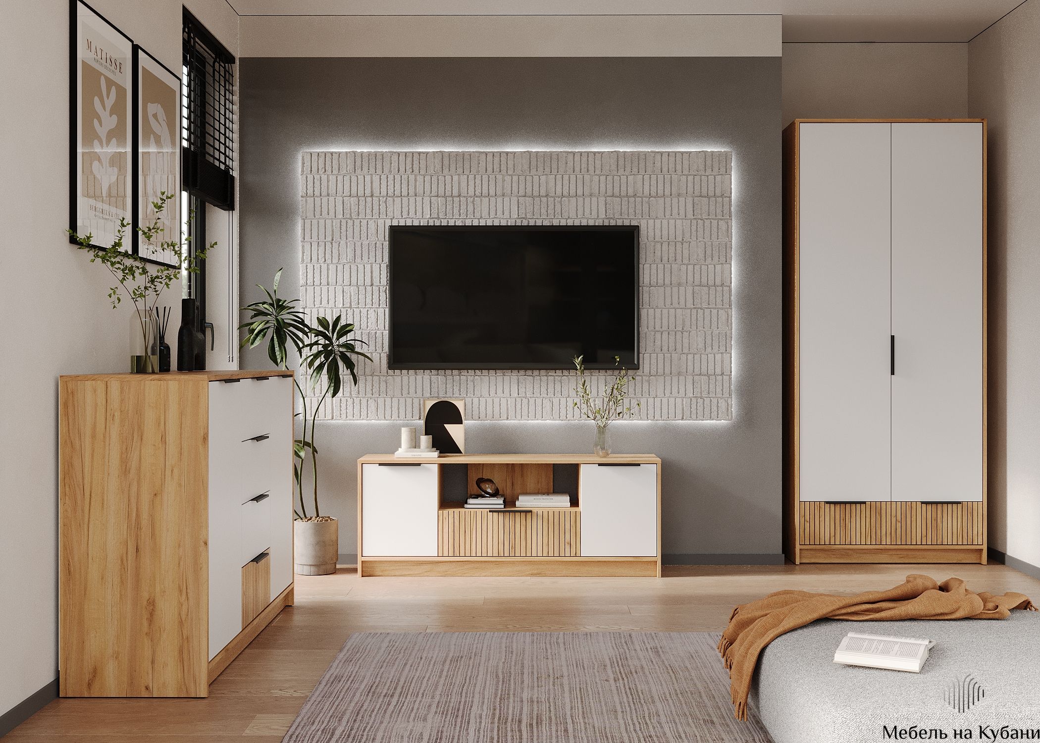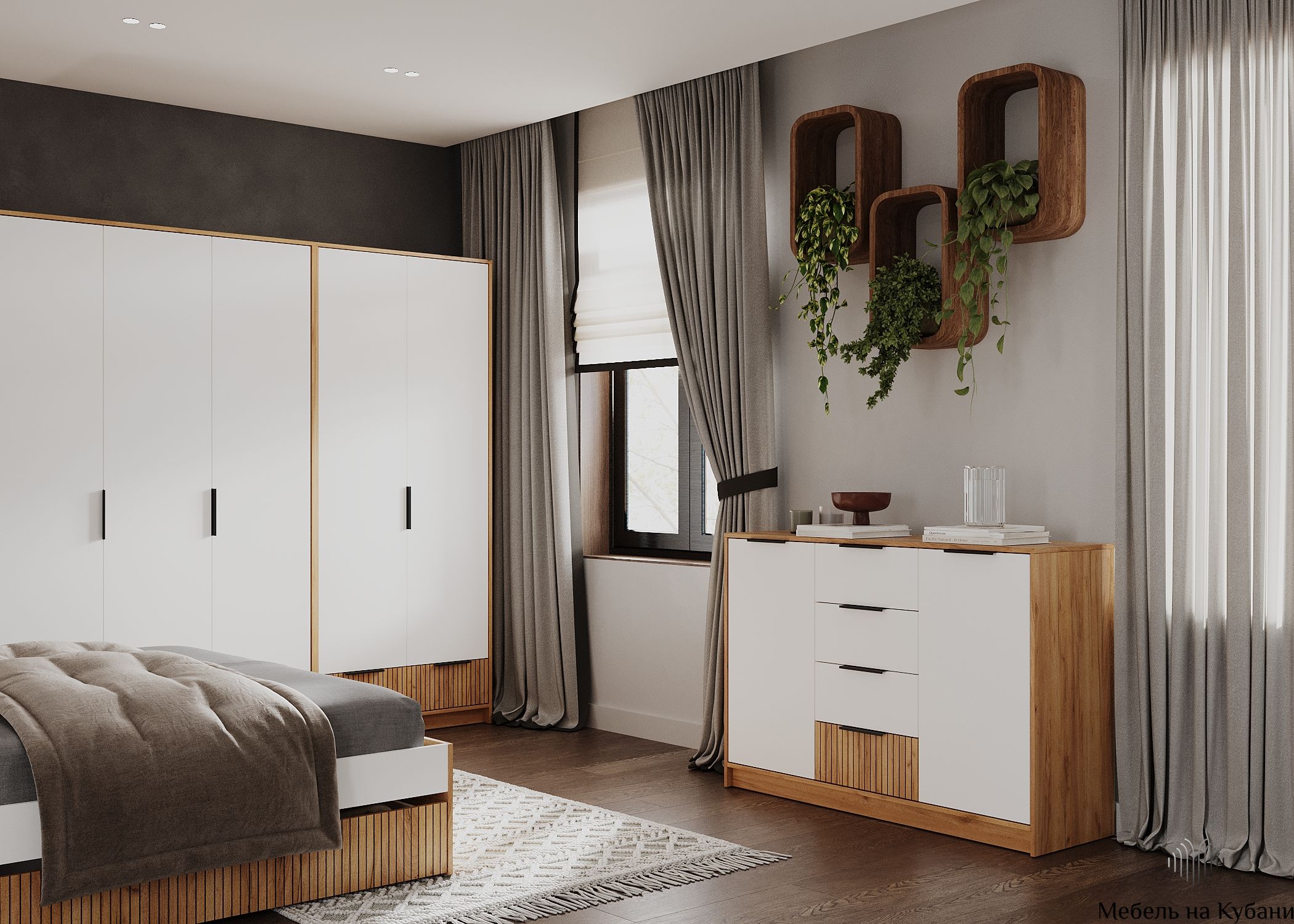 Этот комод сочетает в себе просторные ящики для мелких вещей и удобные открытые полки за створками.