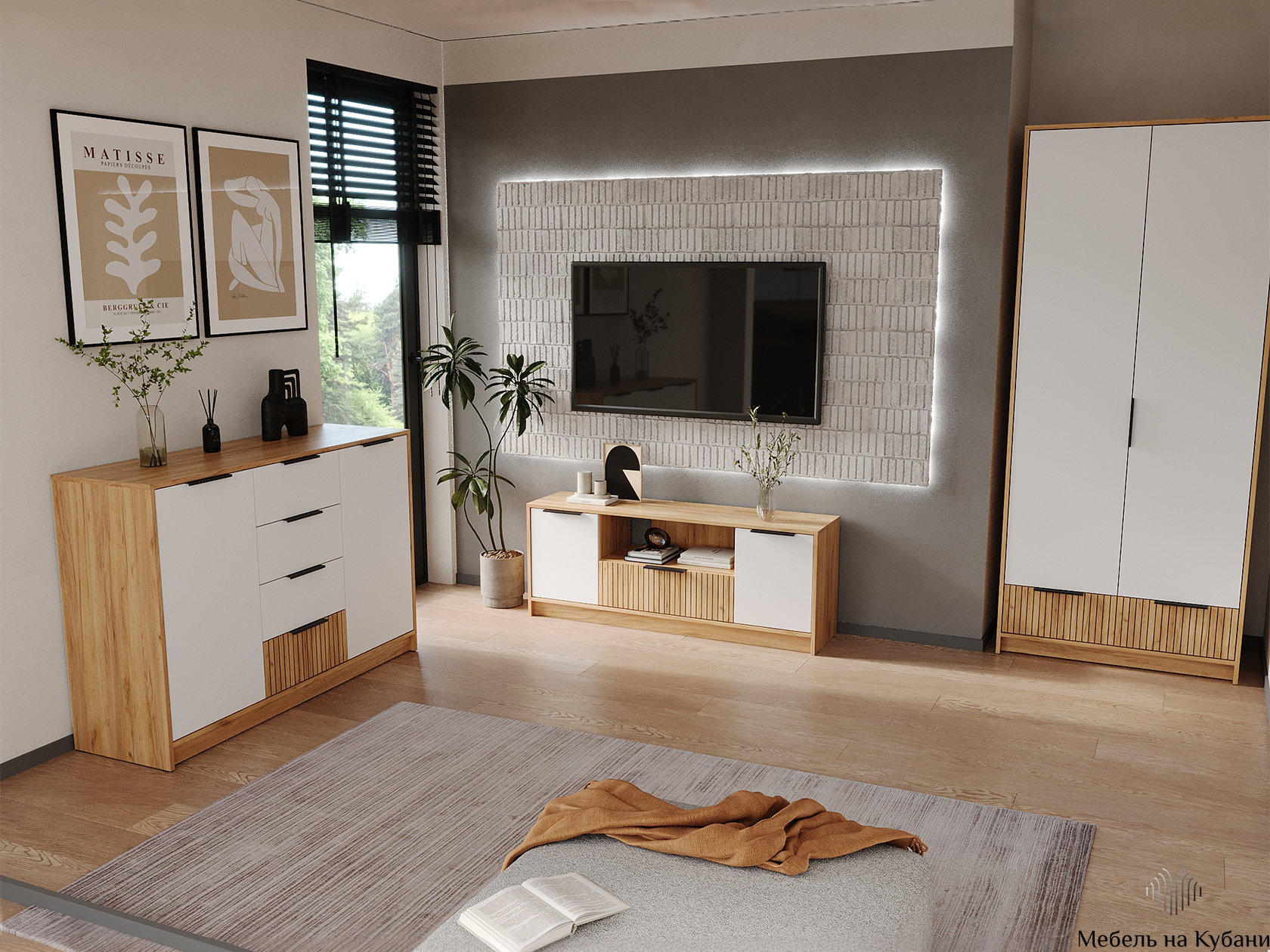 ТВ-тумба Ивис подойдет для размещения широкоформатного телевизора и других мультимедийных устройств. Разноплановые отделения помогут поддерживать порядок в комнате. Центральная часть украшена фотопечатью. Мягкий древесный оттенок в сочетании с матовыми фасадами добавит обстановке уютный акцент.