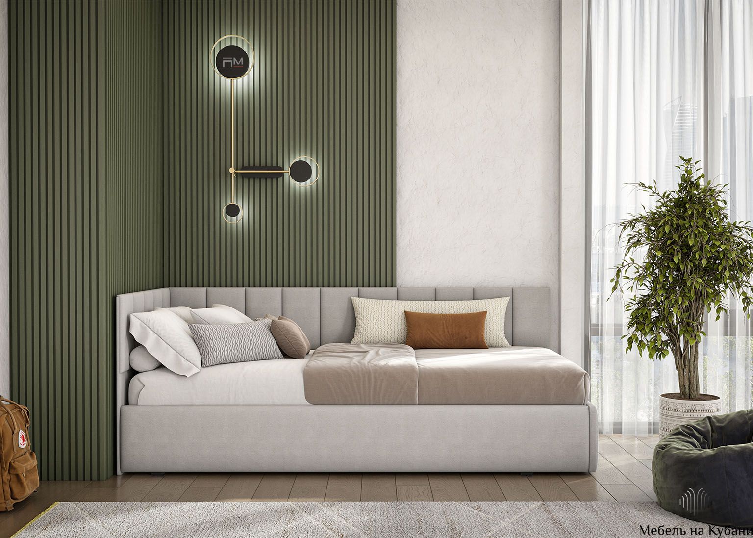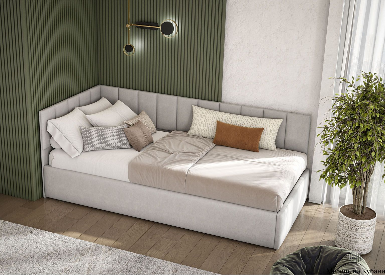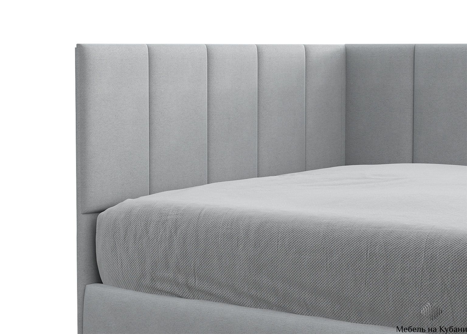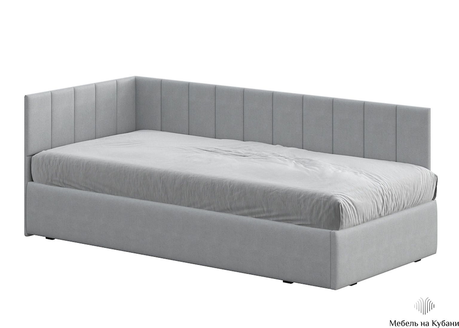Спальное место размером 900 × 2000 мм обеспечивает удобный и полноценный отдых. Модель комплектуется сплошным основанием, что избавляет от необходимости приобретать его отдельно. Мягкое изголовье добавляет комфорта при чтении или отдыхе, а угловая конструкция позволяет удобно разместить кровать вдоль стены.