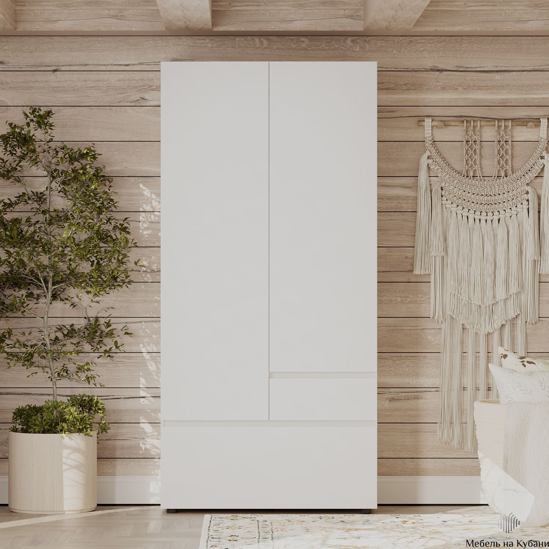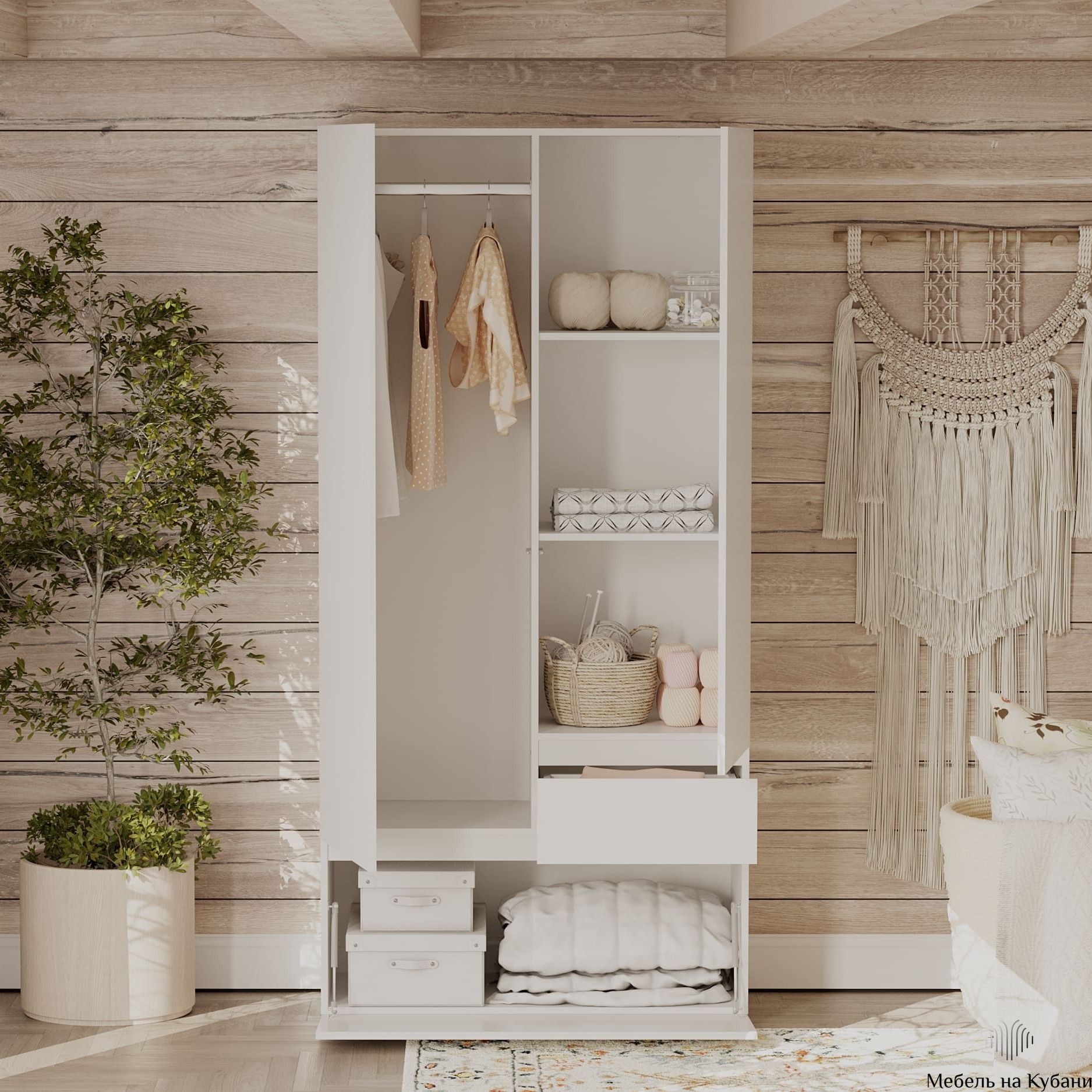 Двухстворчатый шкаф для одежды с полками и штангой.